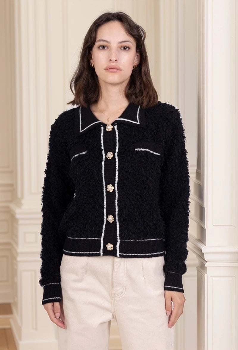 Smuk cardigan store perleknapper med guld. Mega blød og lækker og med krave og kontraks stiklinger.