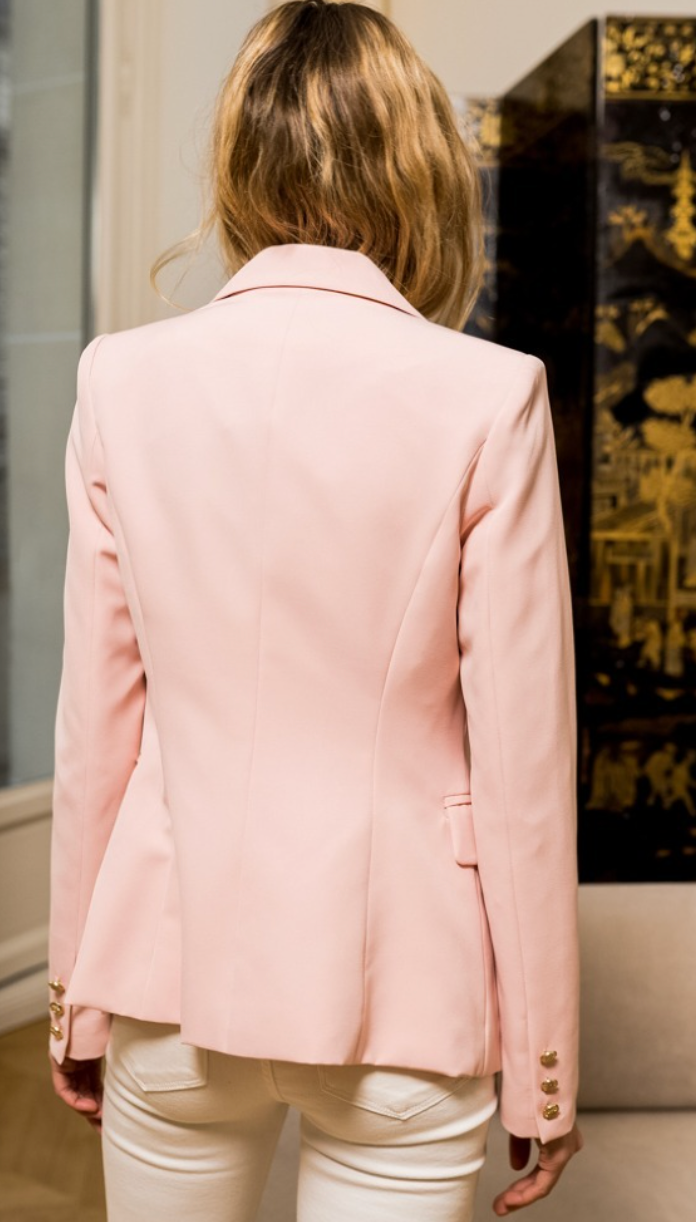 Cool blazer i en skøn rosa farve. Blazeren har skulderpuder, chunky guldknapper og paspolerede lommer fortil.