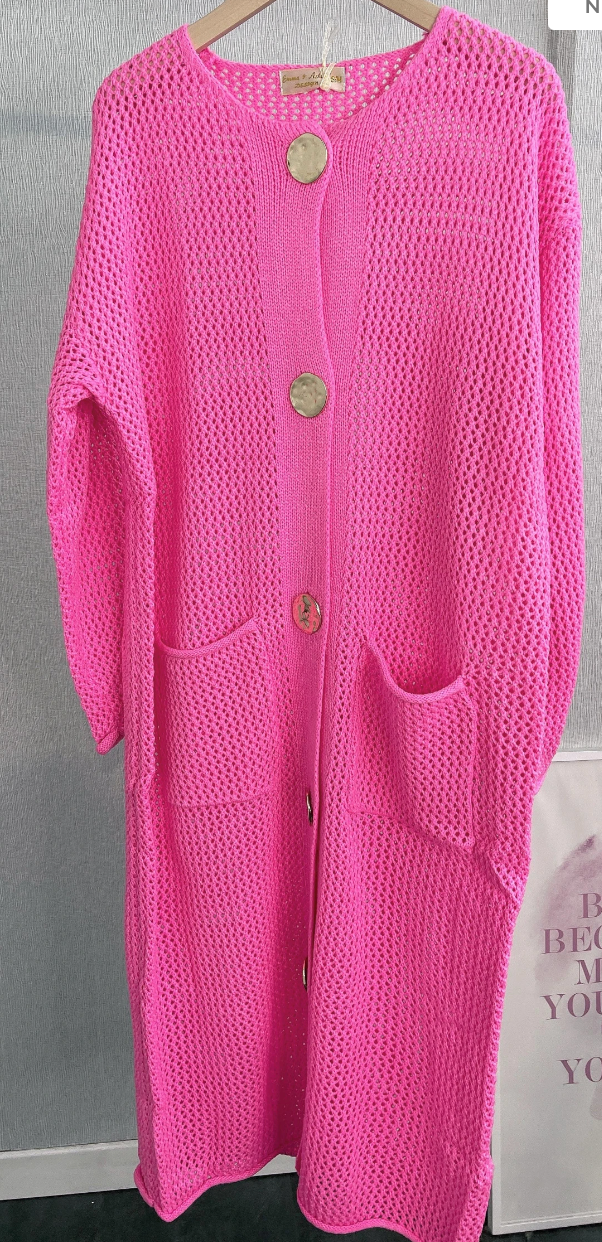 Skøn Strikket cardigan fra Emsig Exclusive med chunky guldknapper. Cardiganen har fin hullet mønster, lommer fortil og er i en lækker kvalitet.