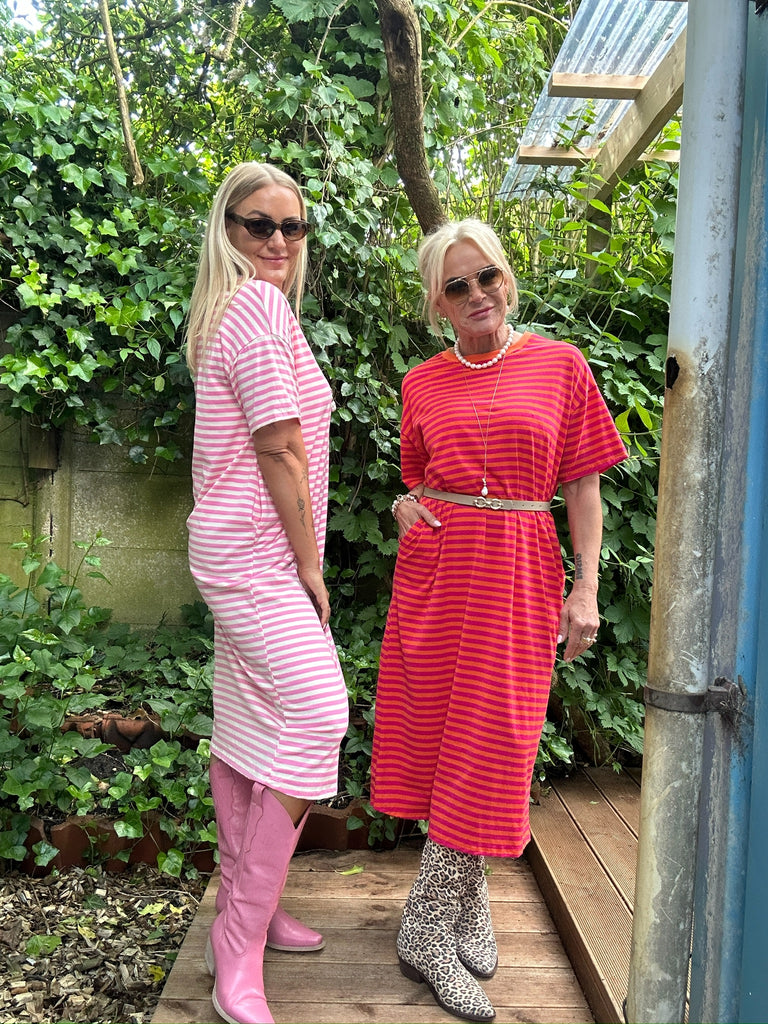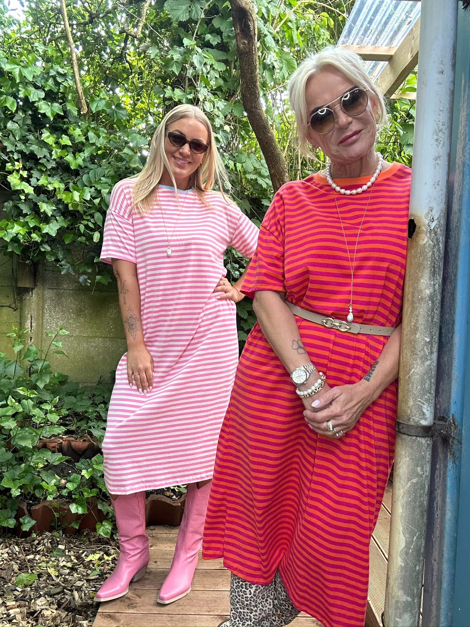 Skøn stribet kjole fra Emsig Exclusive i skønne sommerfarver. Kjolen har en løs pasform og er i en lækker bomuldskvalitet så den er skøn at have på de varme sommerdage. Med rund halsudskæring og lommer i siderne.