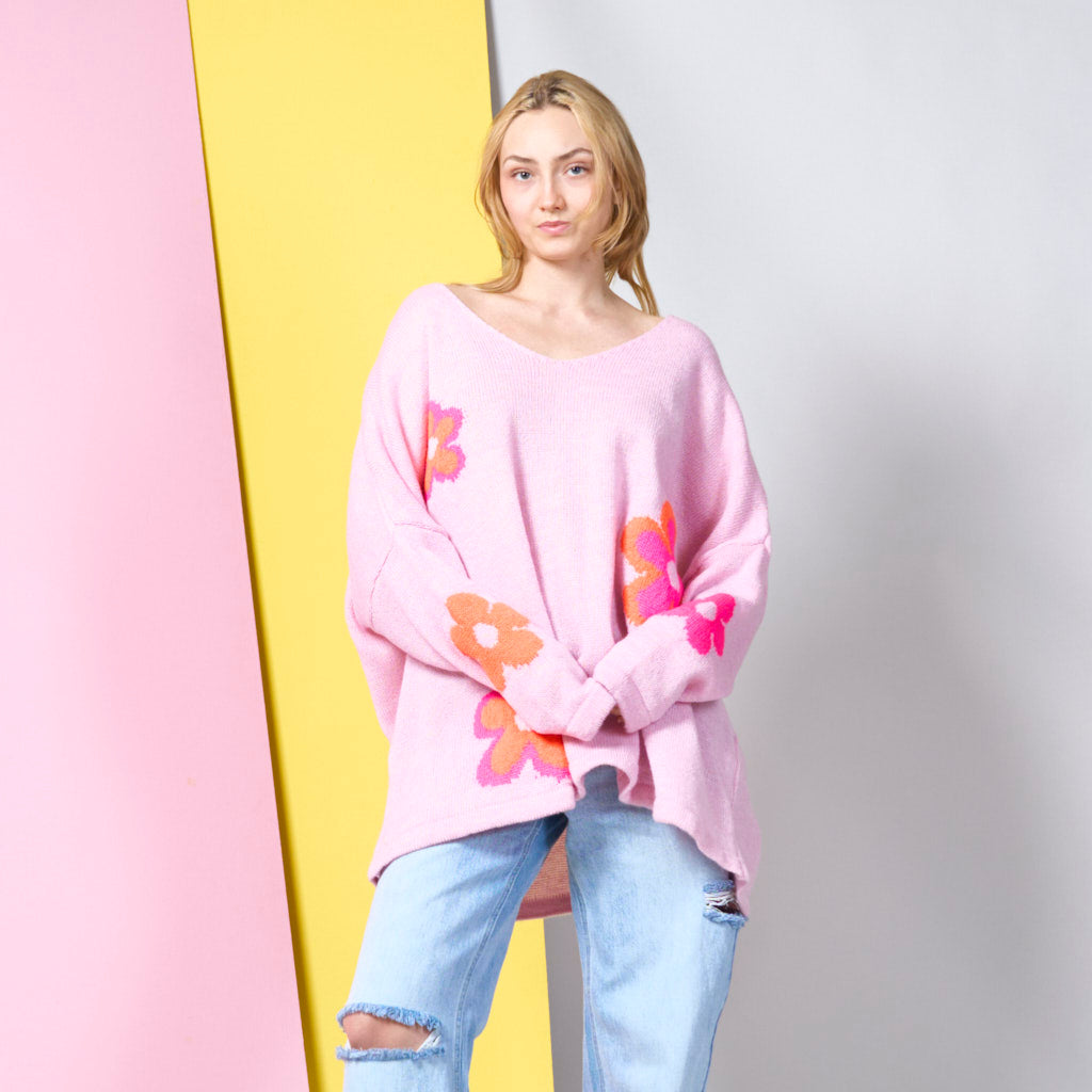 Top fed oversize strik fra Emsig Exclusive. Strikken har dyb rund halsudskæring og flotte strikket blomster i pang farver.