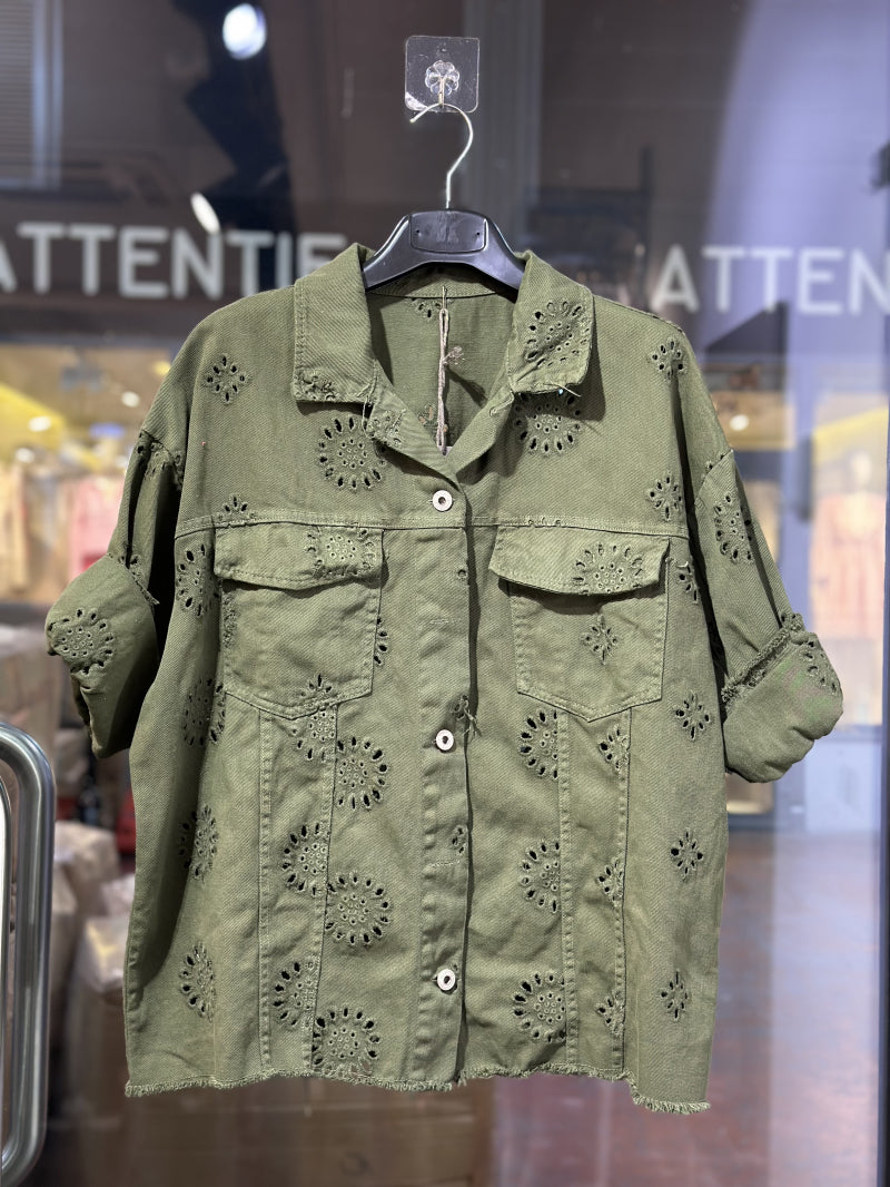 Top fed cowboyjakke med broderianglaise detaljer. Jakken er i en skøn denimkvalitet og har rå kanter.