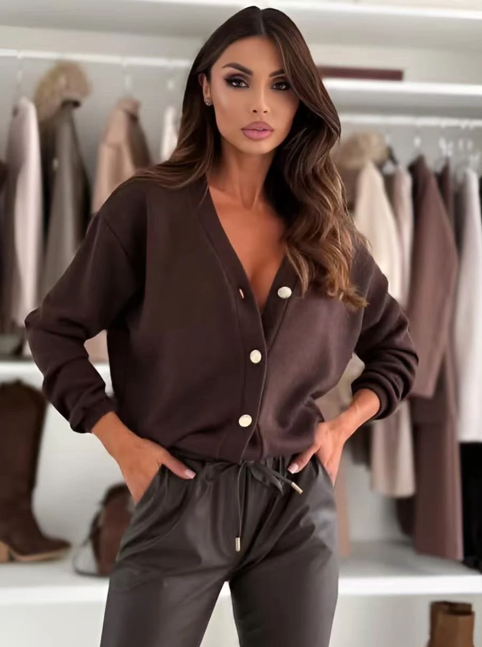 Fin cardigan fra Emsig Exclusive i en blød kvalitet. Cardiganen har en løs pasform og lukkes med fine guldknapper.
