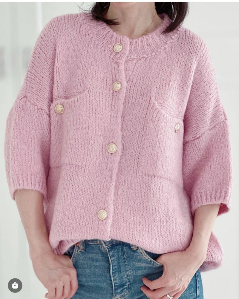 Kortærmet strikket cardigan i pink. Cardiganen er gennemknappet med de fineste store "guld" knapper.