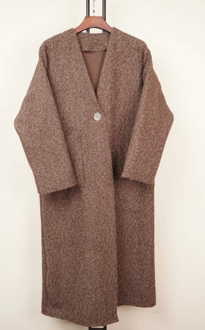 Sejeste lange "cardi-jakke" i boucle med guldknappe. Kan virkelig få dig til at holde varmen samtidig med, at den er top cool. Kan bruges som overgangsjakke og cardigan.