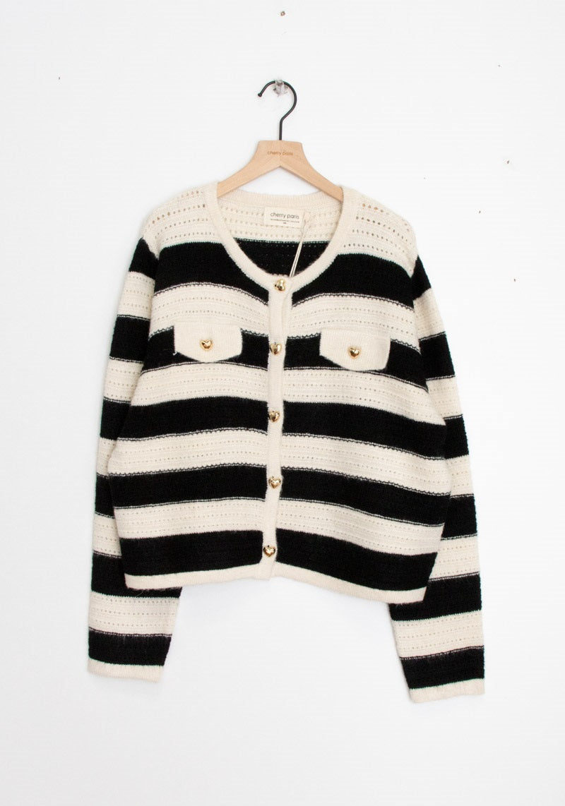 Fineste cardigan fra Emsig Exclusive. Cardiganen er i en lækker blød kvalitet, har vandrette striber og lukkes med de fineste hjerteknapper i guld.
