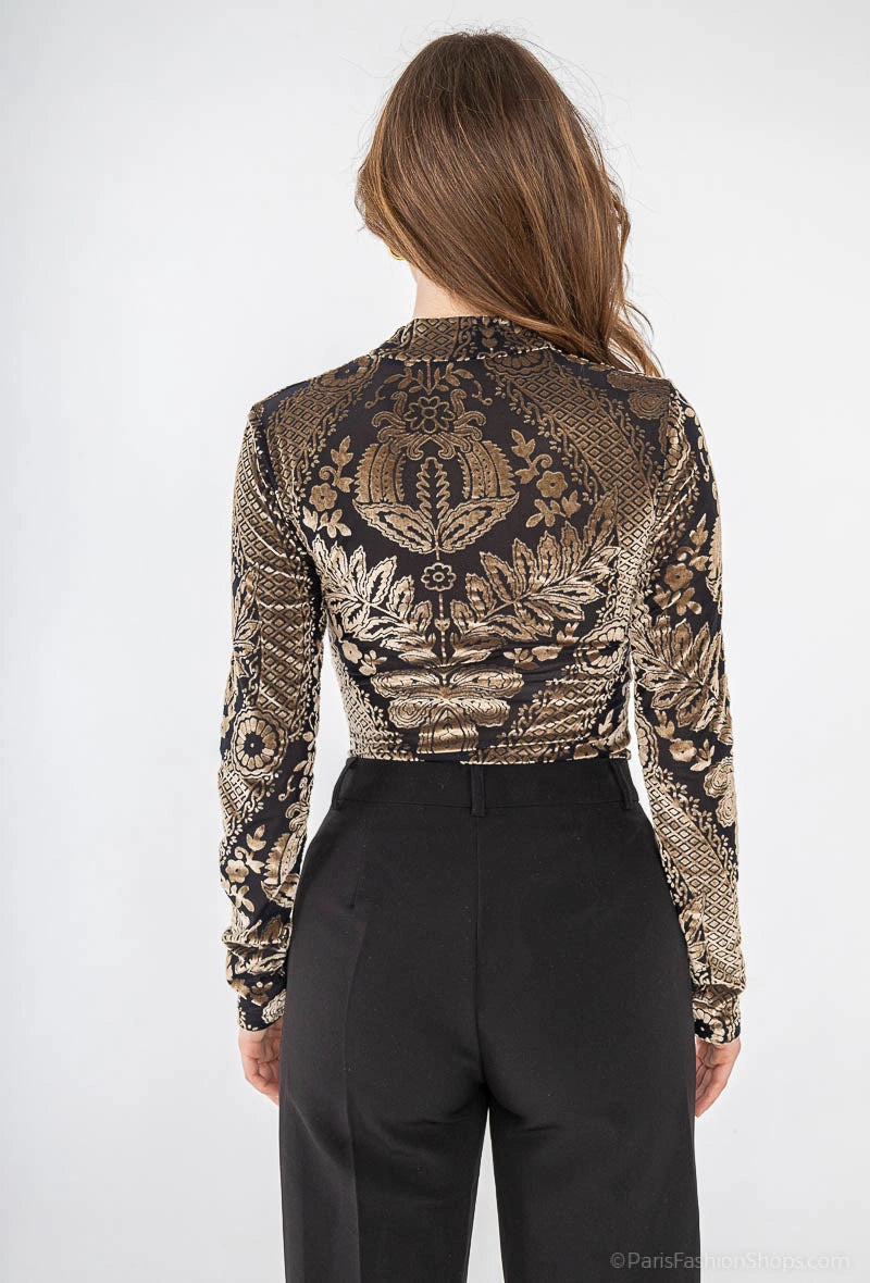 Smukkeste bodystocking i let transparent mesh. Med lange ærmer, høj hals og masser af guld-velour dekoration.