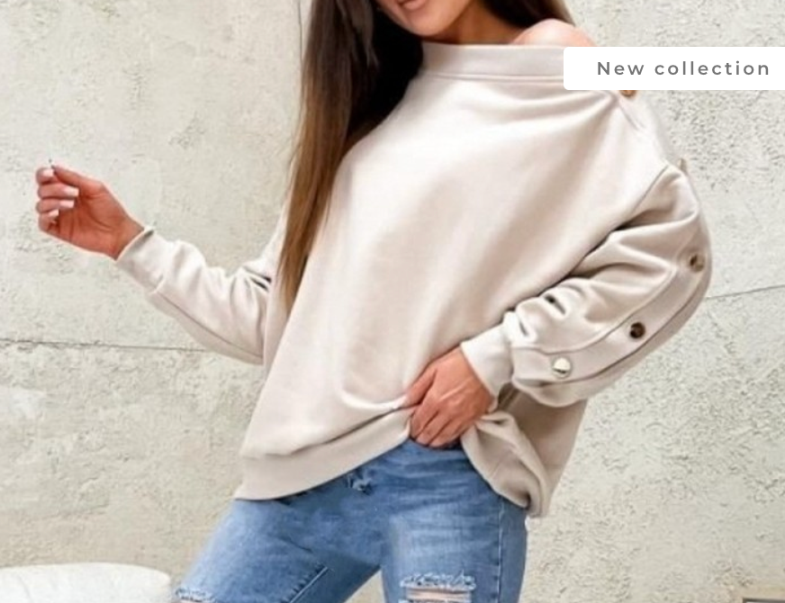 Fed sweater med knappe detaljer langs ærmet. Er i en tynd sweater kvalitet og har en stor åbning ved halsen.