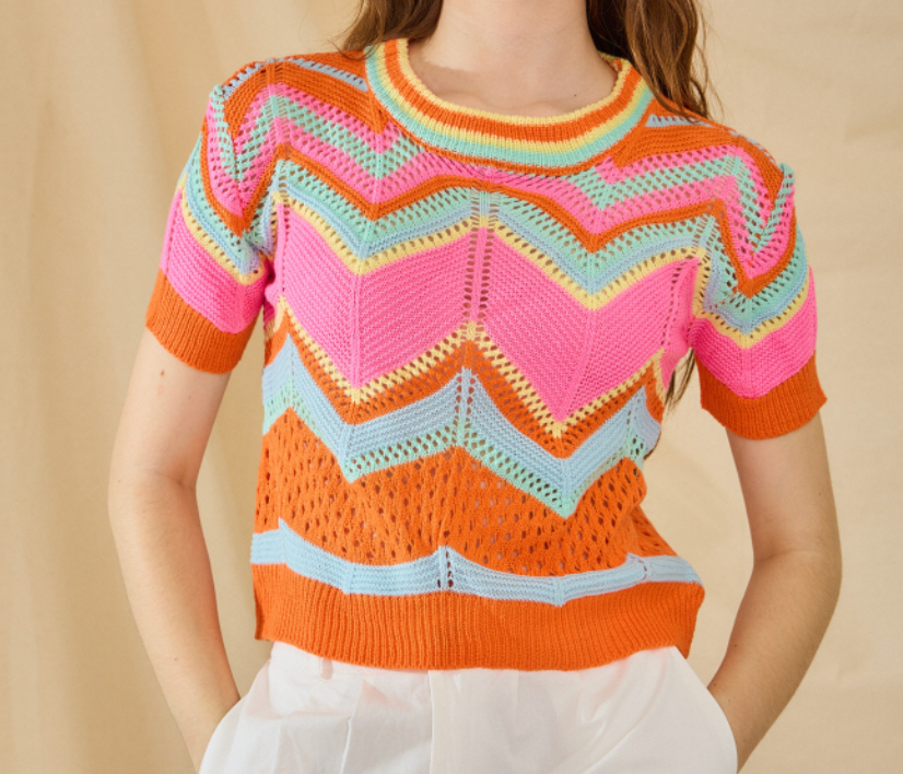 Skøn crochet strik fra Emsig Exclusive. En rigtig "Emsig Style" med knald på farverne og som kan styles i en uendelighed. Strikken har korte ærmer og er et "must have" til forårsgarderoben.