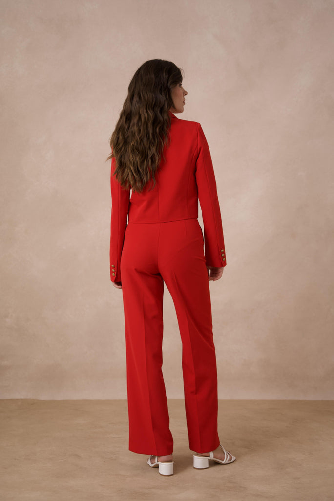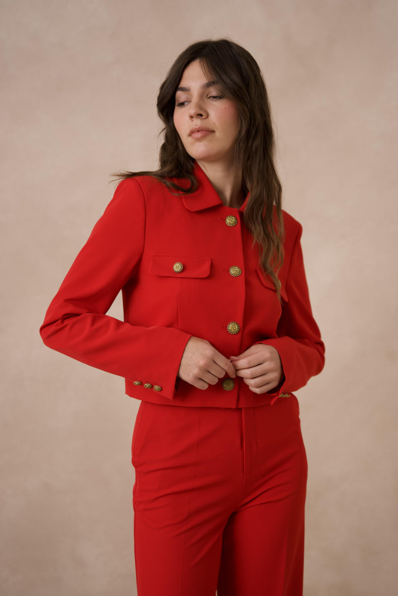 Cool blazer fra "Emsig Exclusive" i en cropped model med fede guldknapper. Blazeren har skulderpuder og paspolere lommer fortil.
