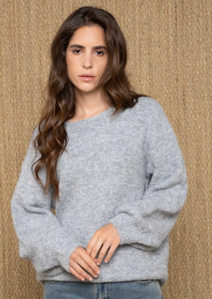 Skøn oversize strik fra Emsig Exclusive. Strikken har en løs pasform, ærme med let balloneffekt og fin blondedetalje bagpå.