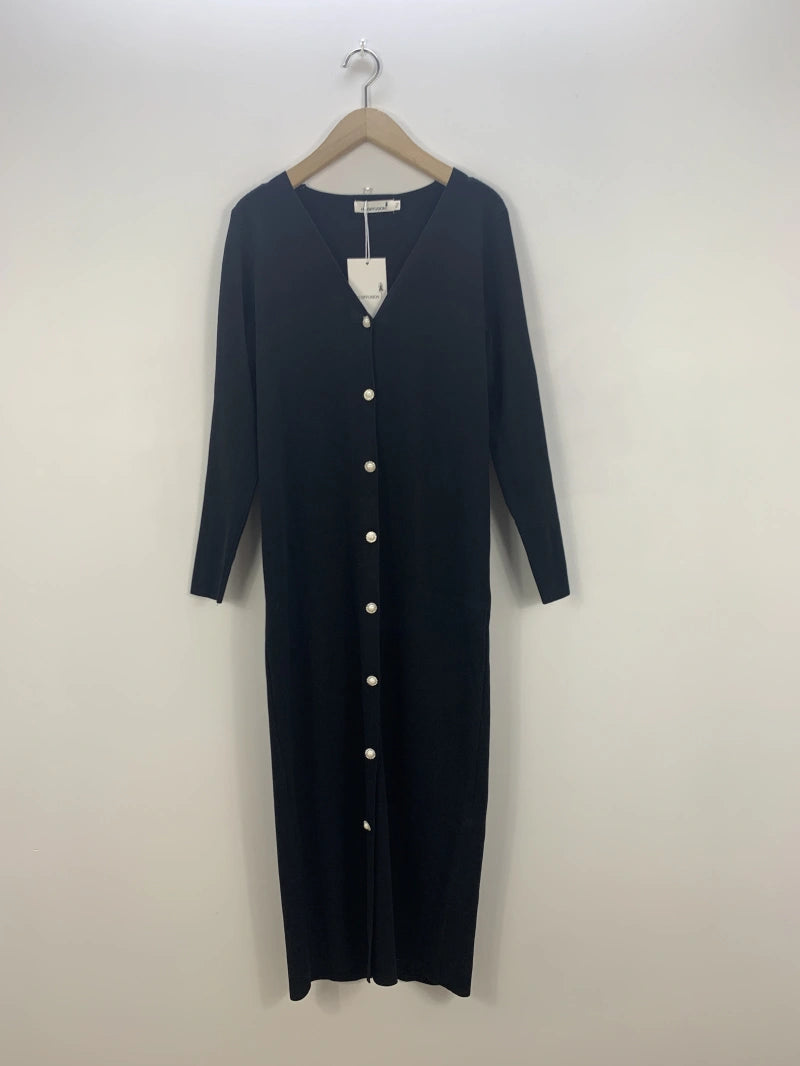 Cool kjole fra Emsig Exclusive i en lækker viskosemix. Kjolen er med masser af stretch, i en rib metervare. Med v-udskæring og de flotteste knapper.