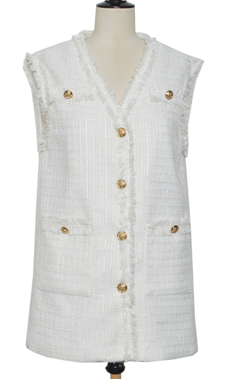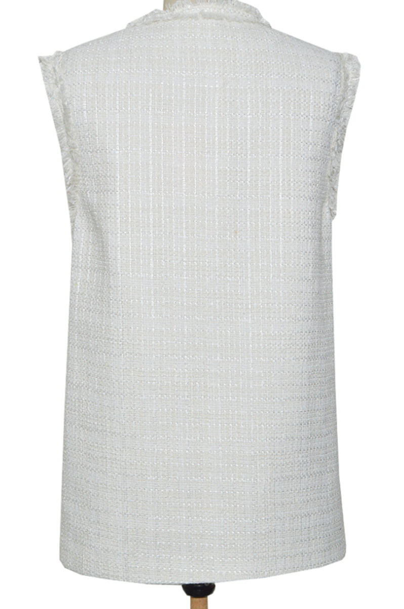 Smukkeste tweed vest fra Emsig Exclusive i hvid. Vesten har fine frynsedetaljer, lommer fortil og chunky guldknapper.
