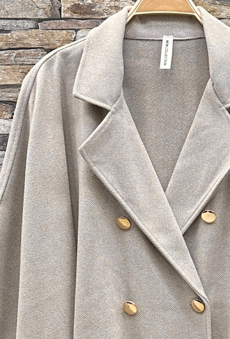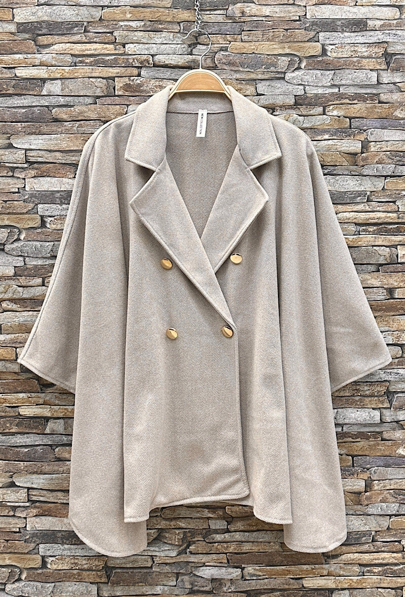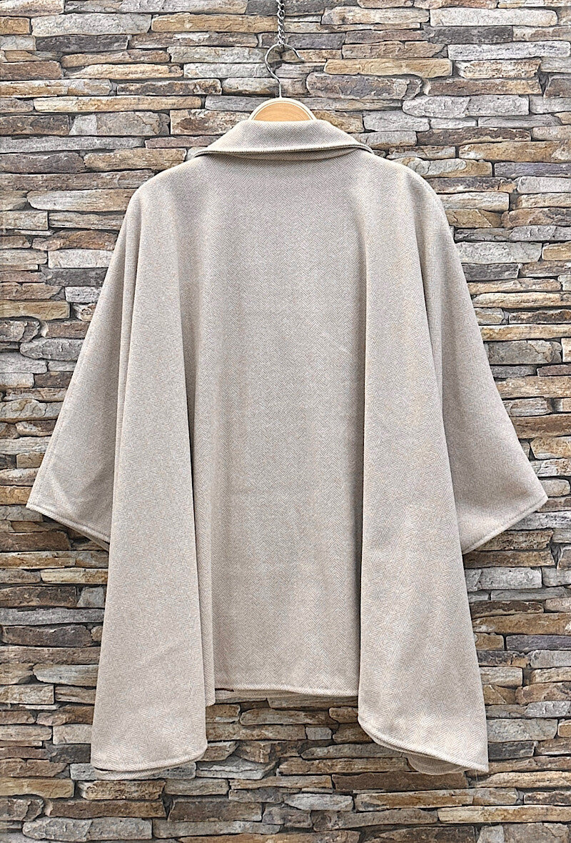 Skøn poncho cardigan i en flot beige farve med tone i tone mønster. Jakken har en løs pasform og fine guldknapper fortil.