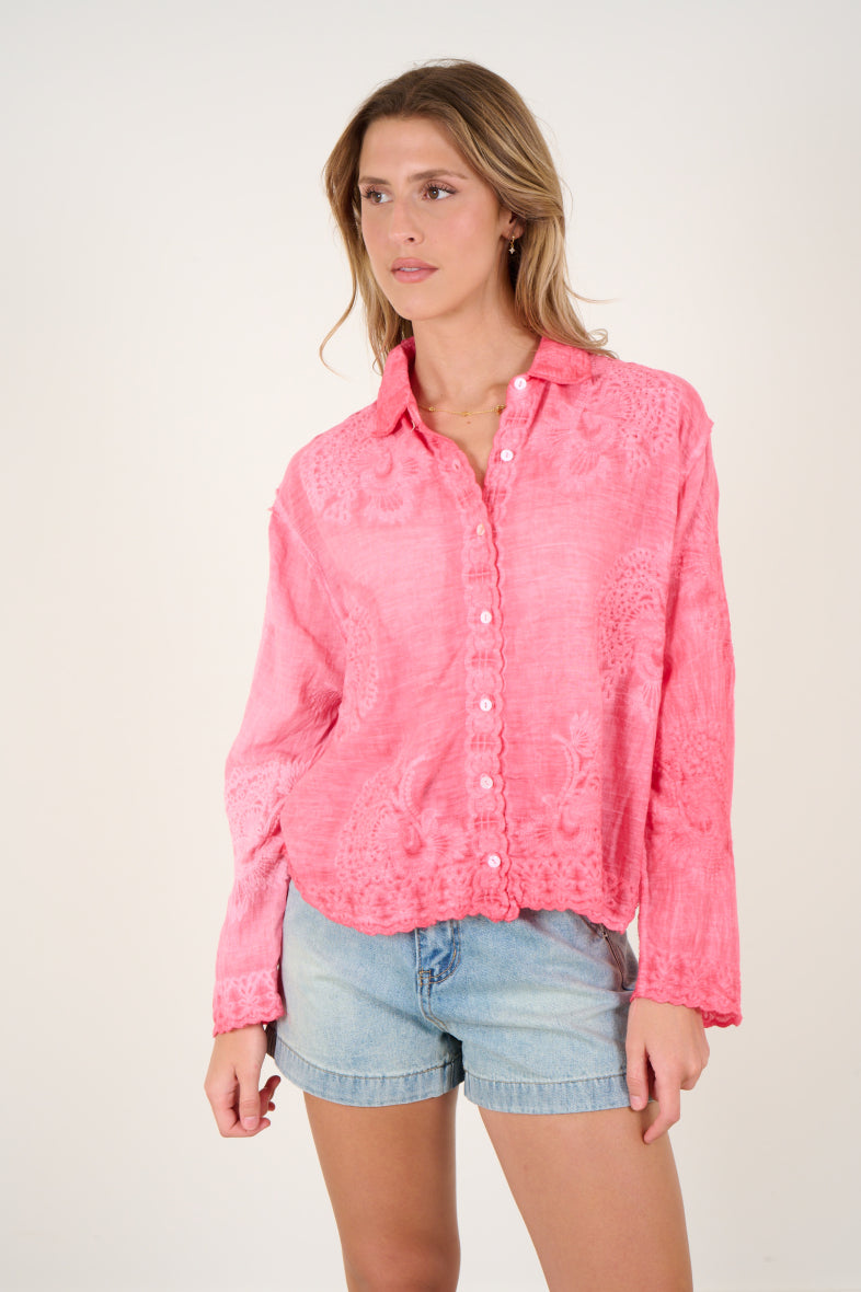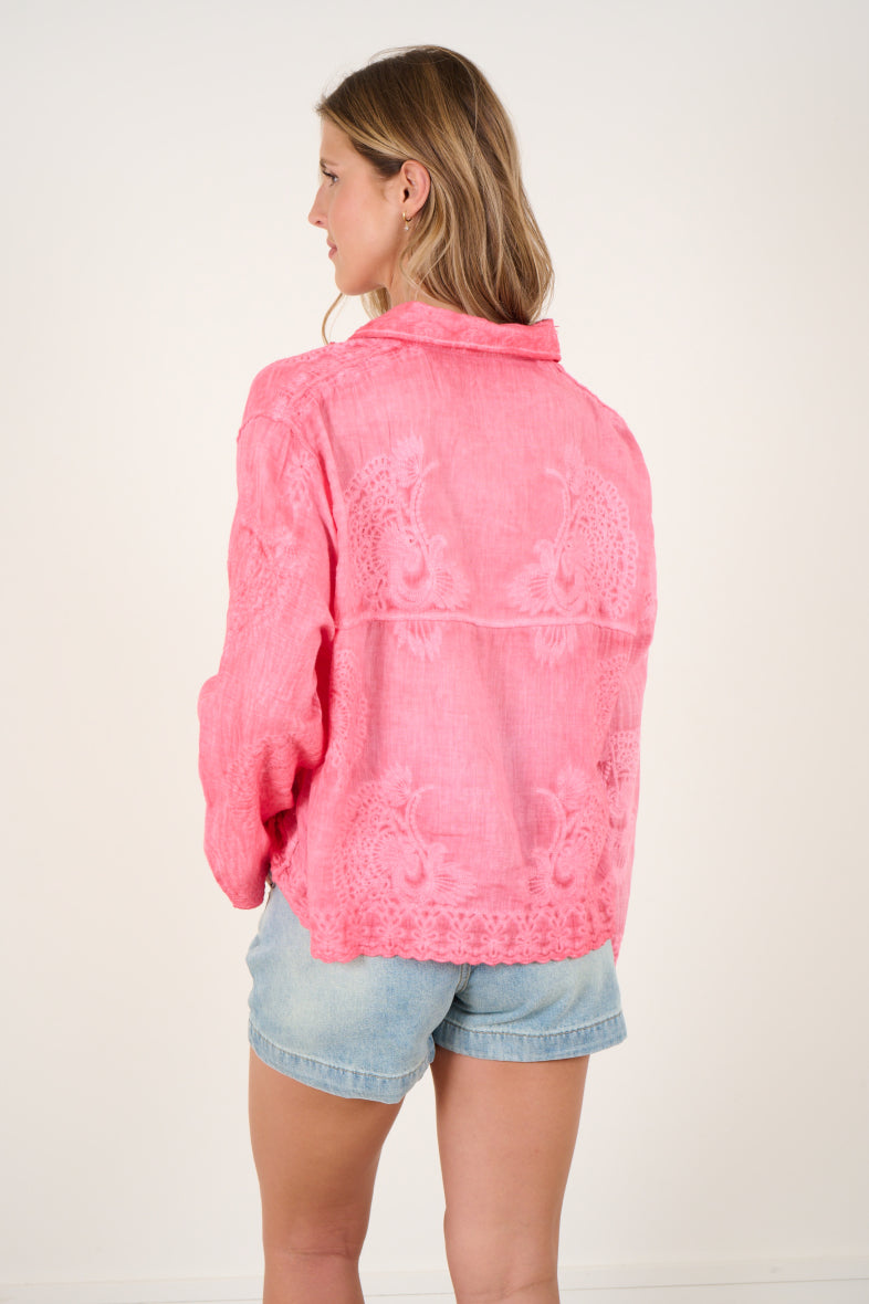 Skøn bluse med tone i tone broderi fra Emsig Exclusive. Blusen har en løs pasform er finde detaljer.