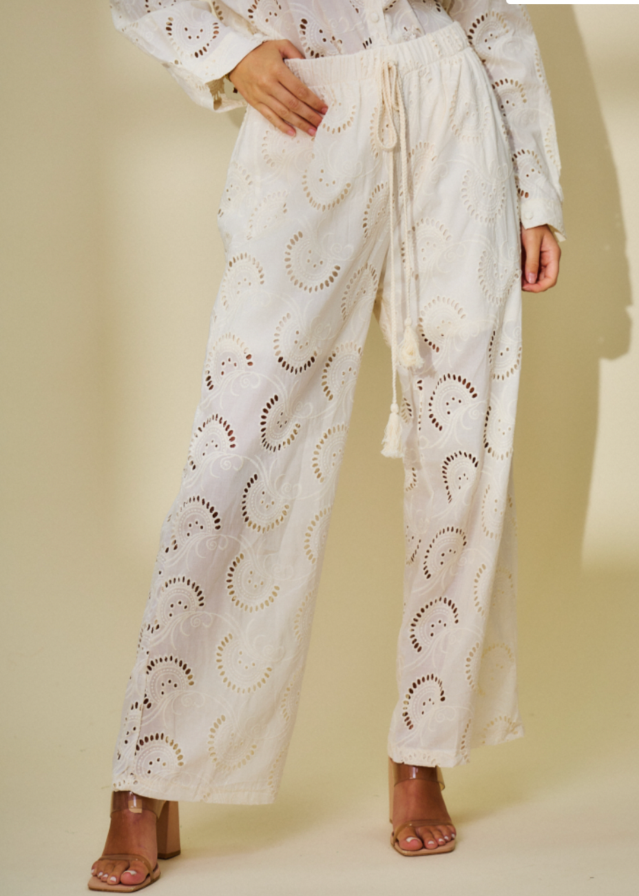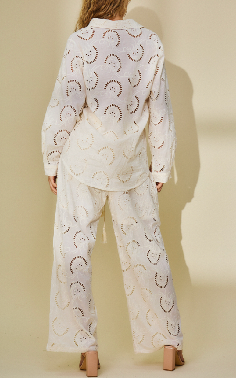Sommersæt i engelsk broderi: langærmet gennemknappet skjorte og velskårne bukser. Let og perfekt til årstiden.
