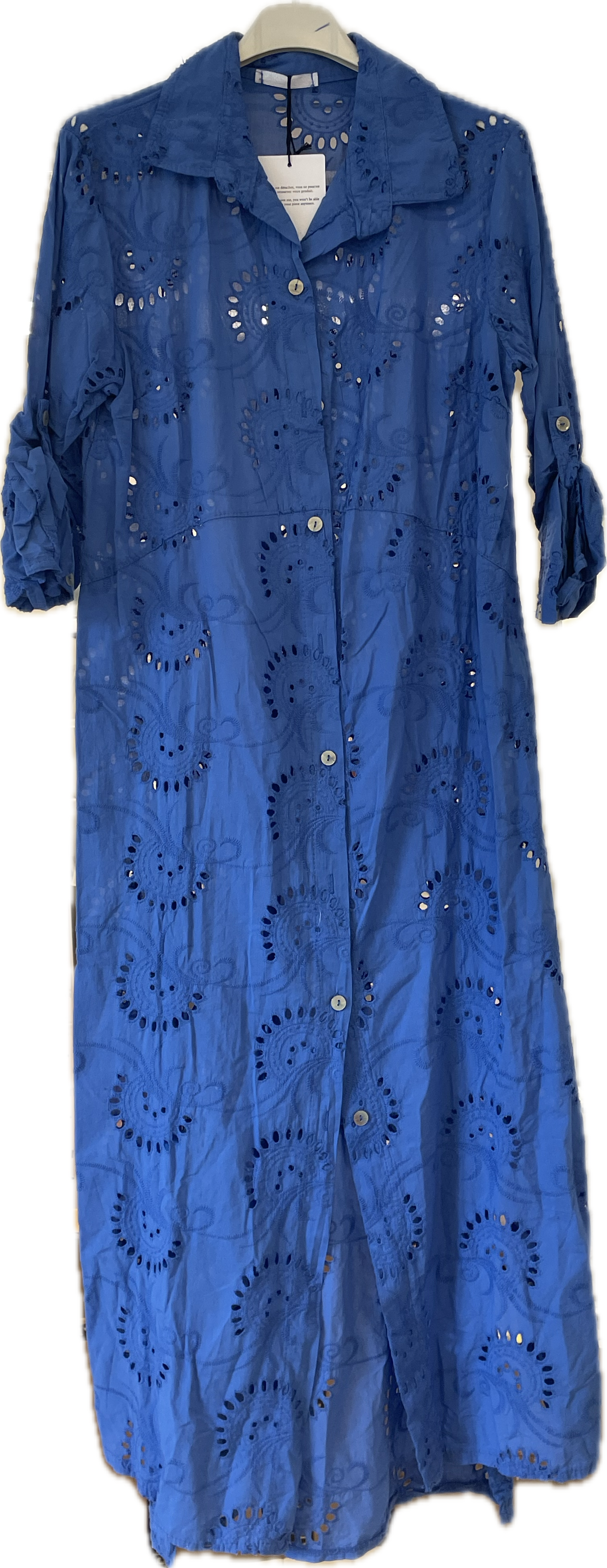 Fineste kjole i broderianglaise fra Emsig Exclusive i ren bomuld. Kjolen har krave og lukkes fortil med knapper.