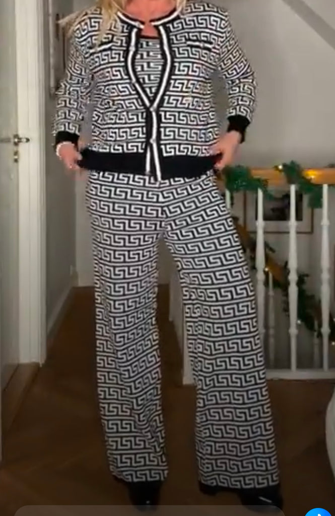 Super smukt sæt i sort og hvid fra Emsig Exclusive. Sættet består af top, cardigan og buks i den lækreste kvalitet. Buksen har blød elastik i talje og vidde i benene. Top med rund hals og cardigan med "lige op og ned" pasform og knapper.
