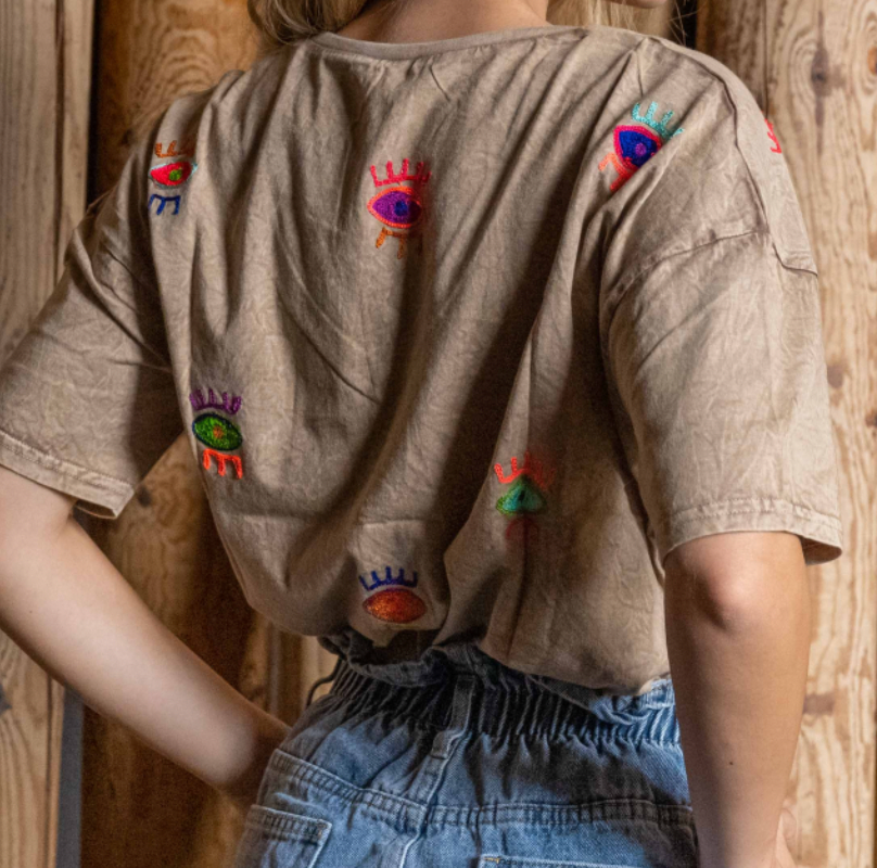 Skøn t-shirt fra Emsig Exclusive i ren bomuld. T-shirten har en hoftekort længde og v-udskæring. Broderinger lavet i hånden - virkelig en luksus t-shirt