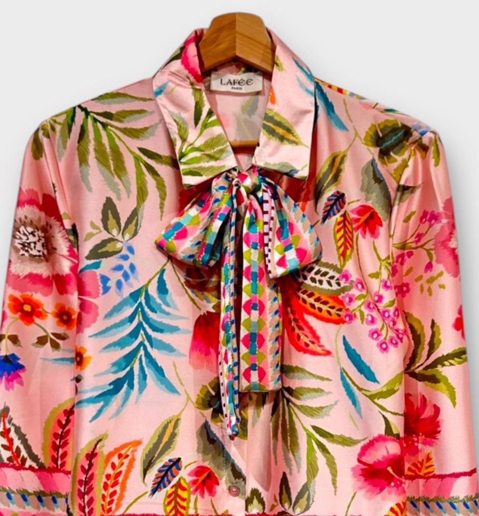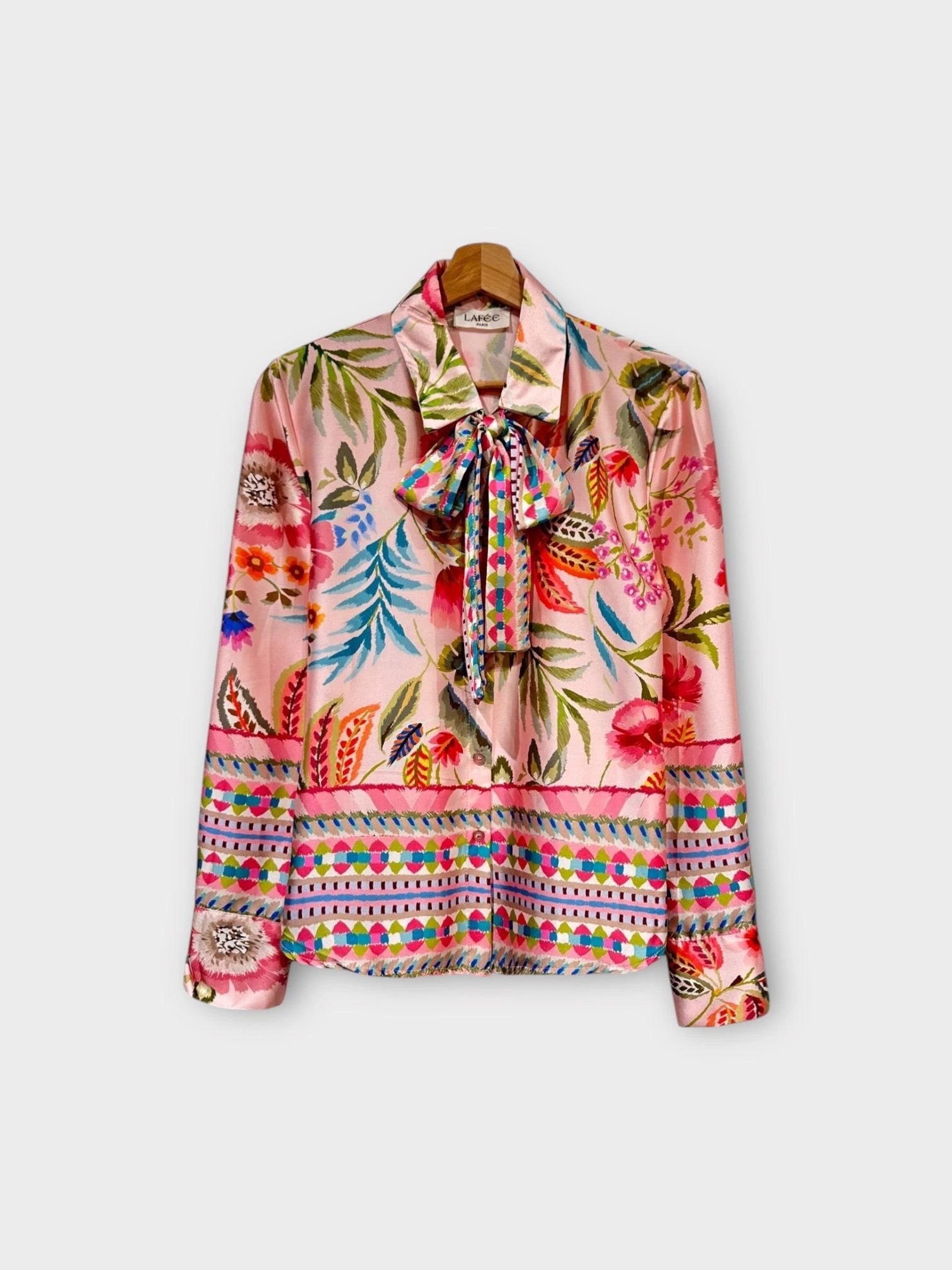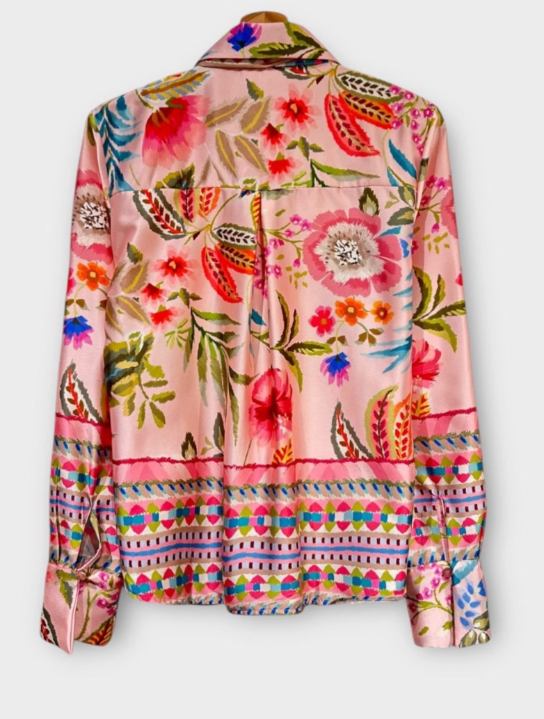 Smuk blomstrede skjorte fra Emsig Exclusive i en silkelignende kvalitet. Blusen har en løs pasform, er gennemknappet og har fin bindedetalje ved krave.