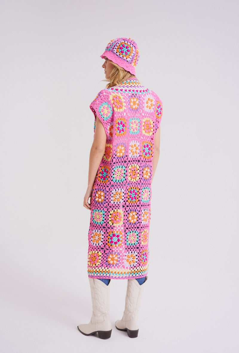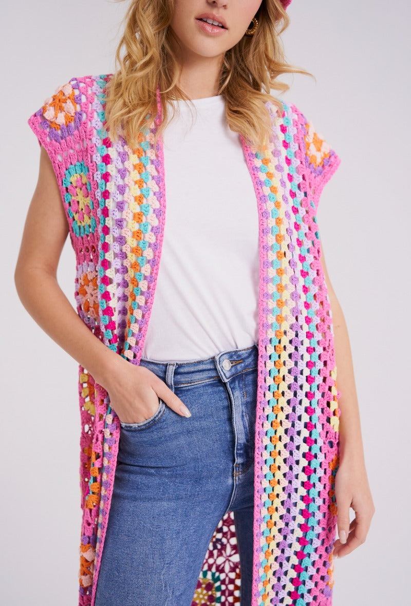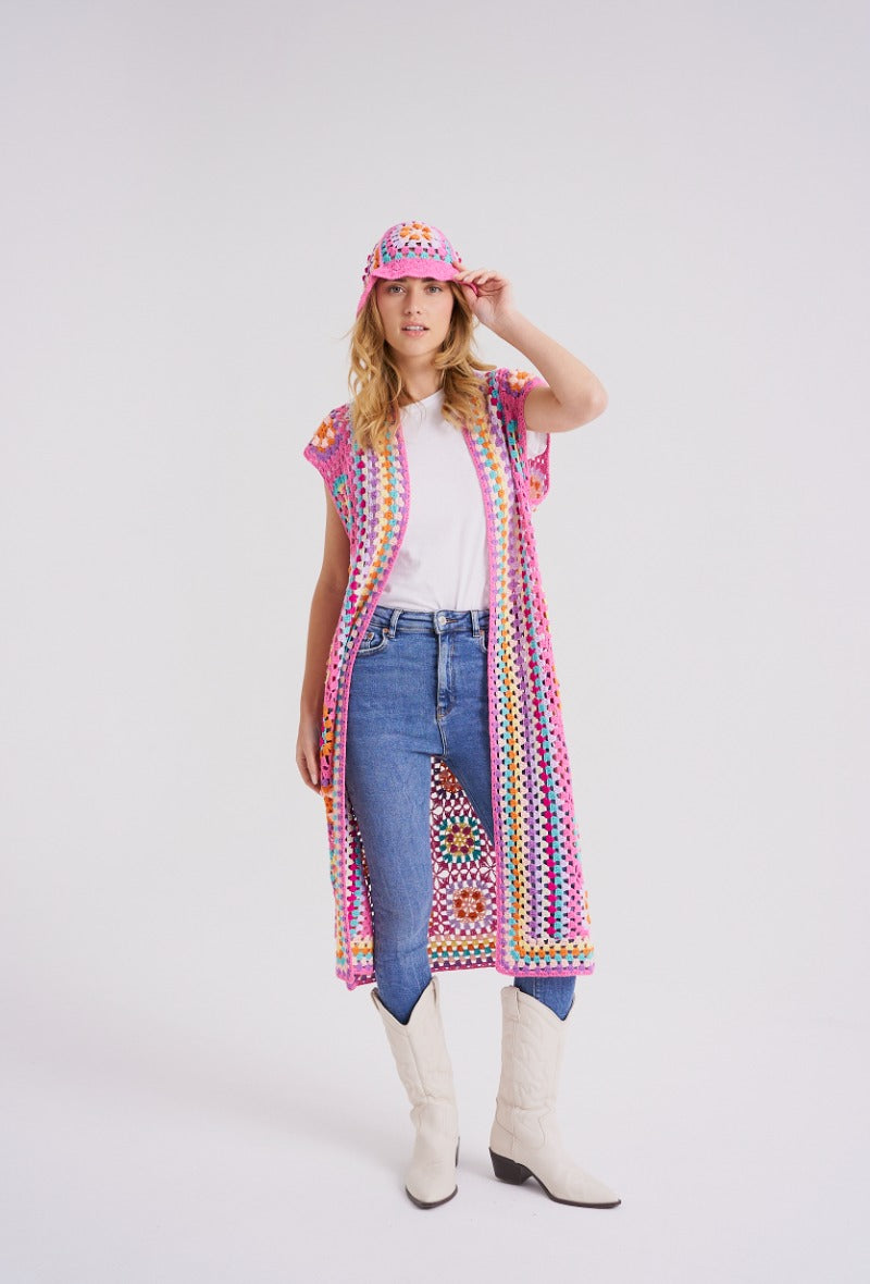 Lang hæklet cardigan i de smukkeste farver!