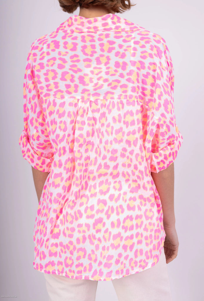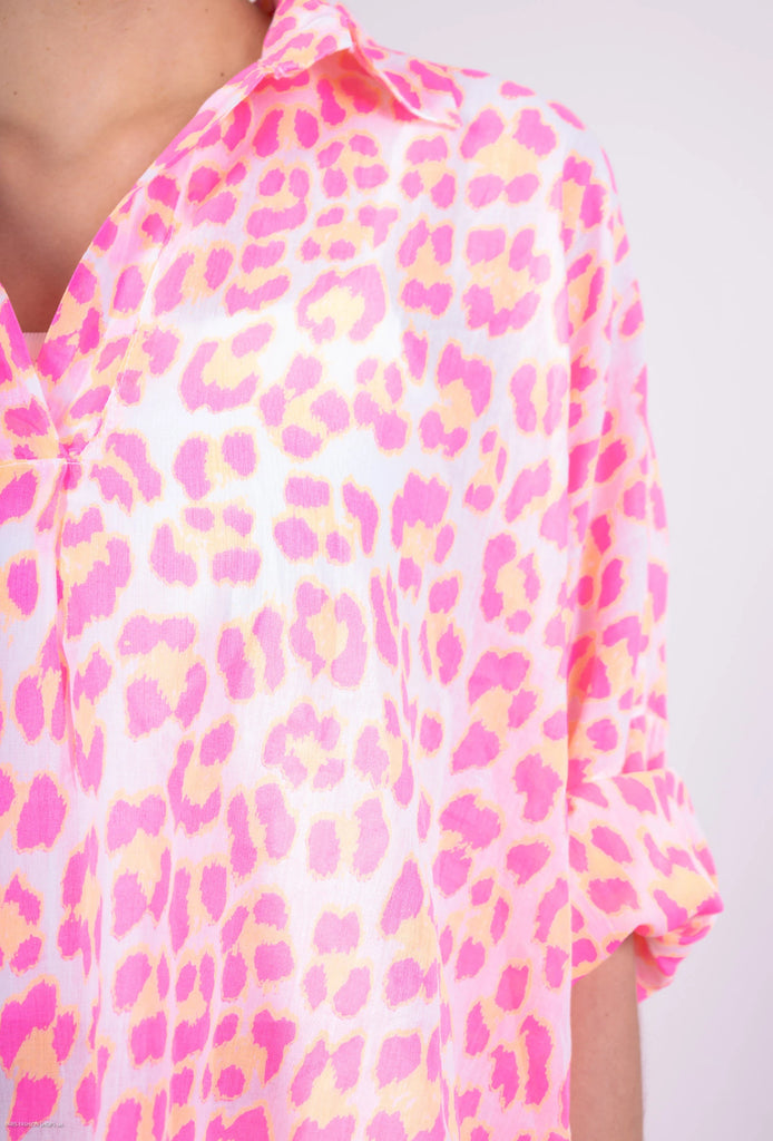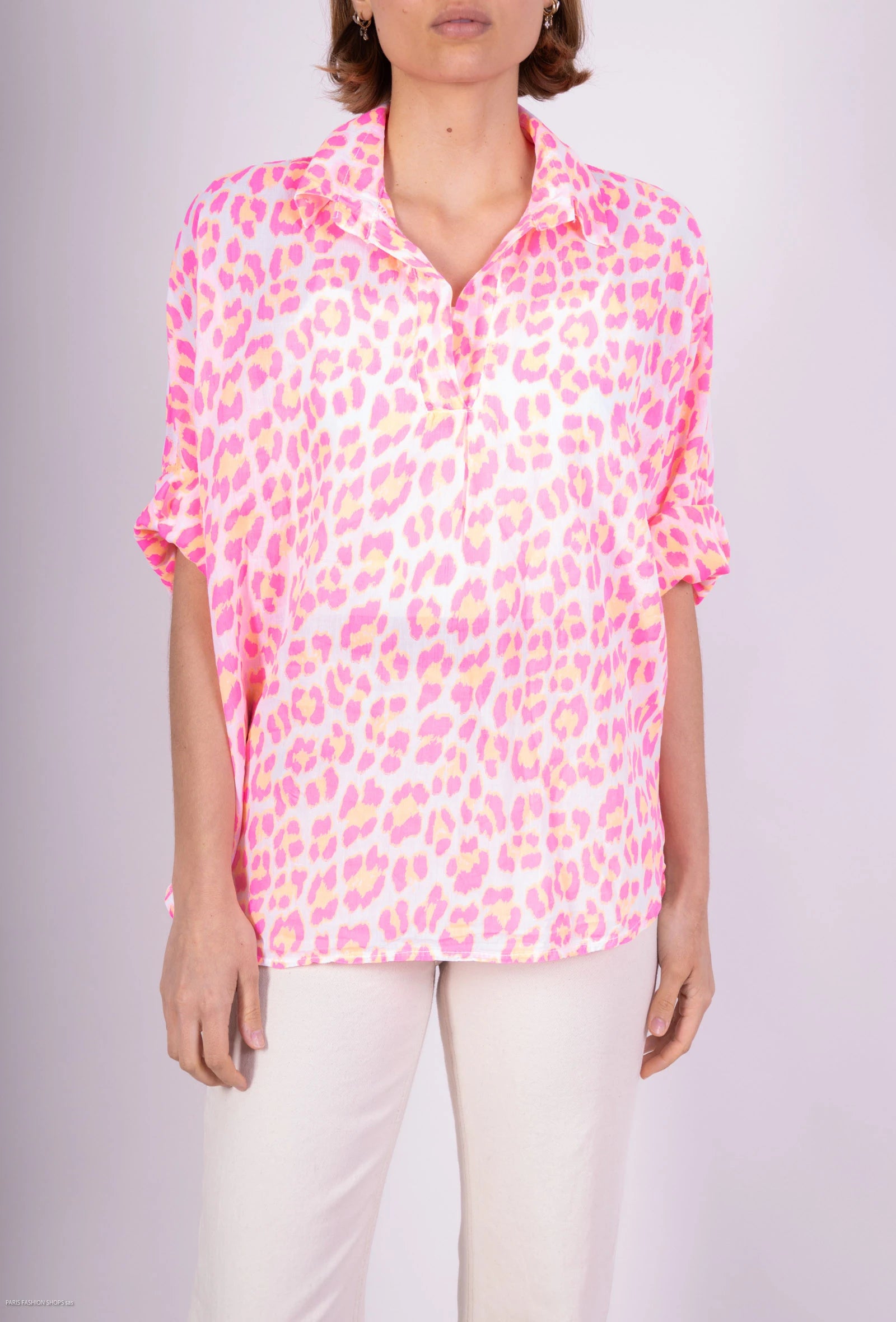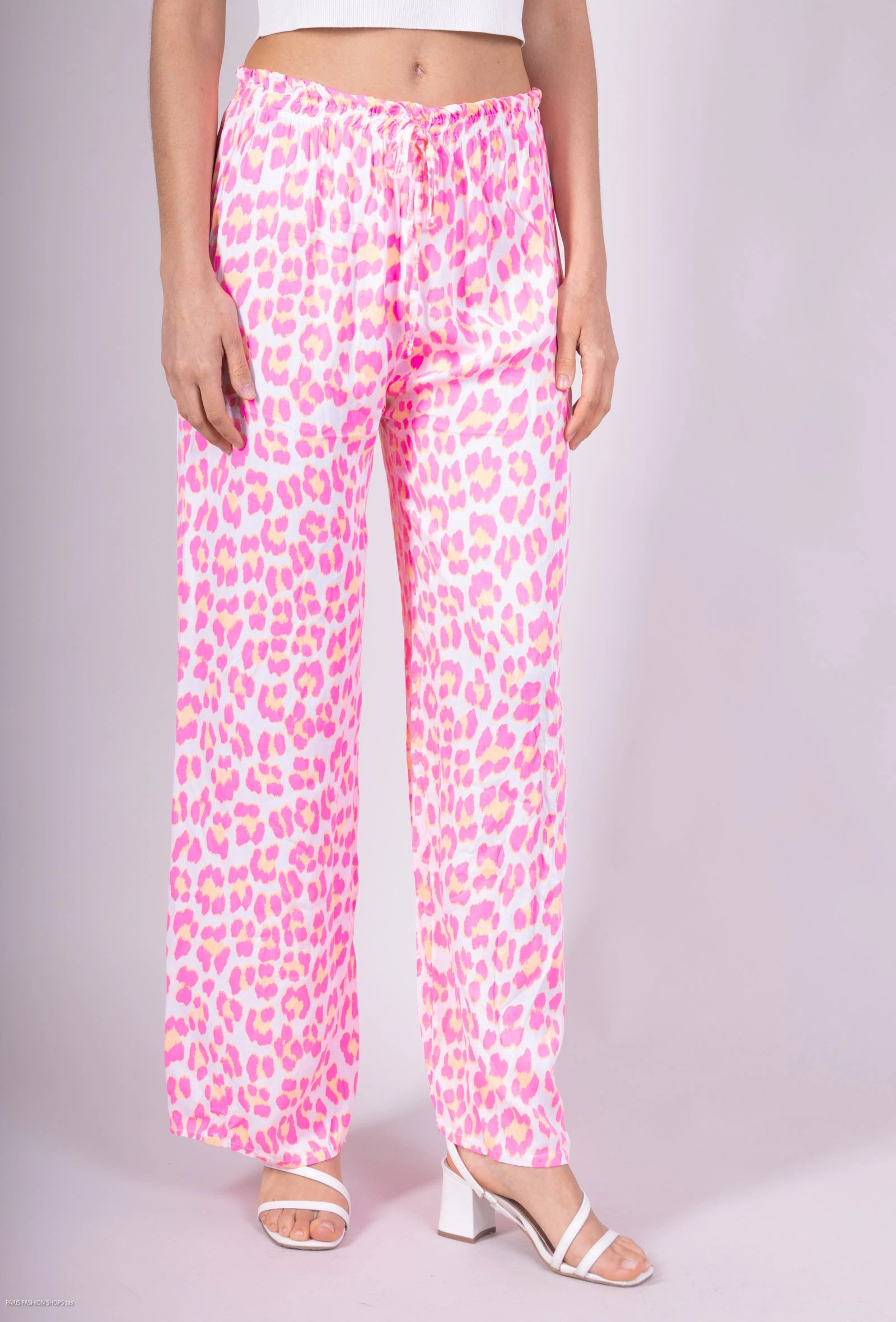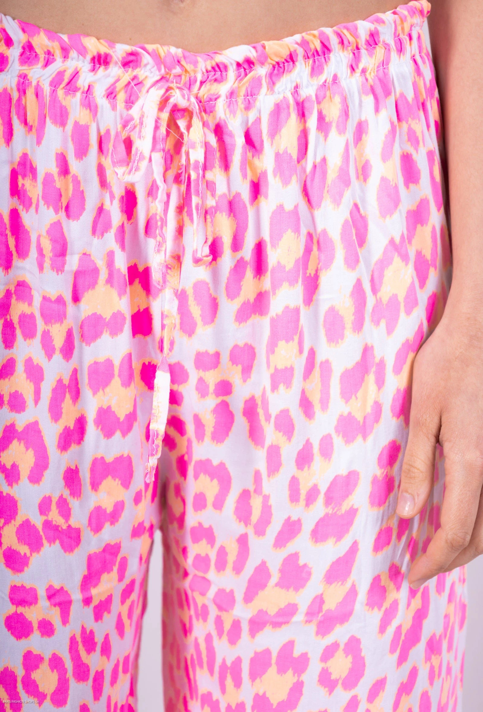 Skønneste sommer-sæt i ren bomuld og viskose fra Emsig Exclusive. Blusen har en løs pasform med v-udskæring og kort ærme. Bukserne er med blød elastik og snøre i taljen.