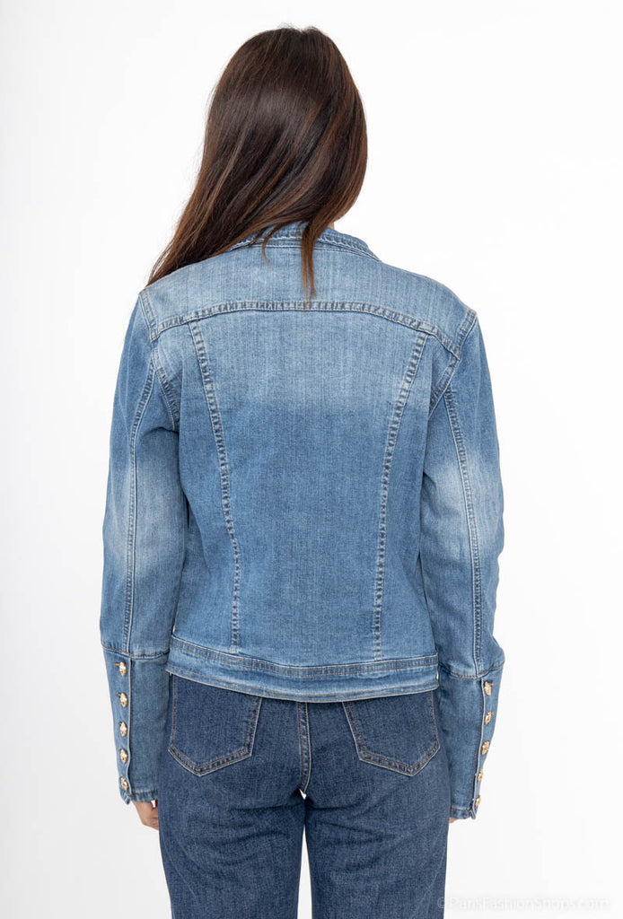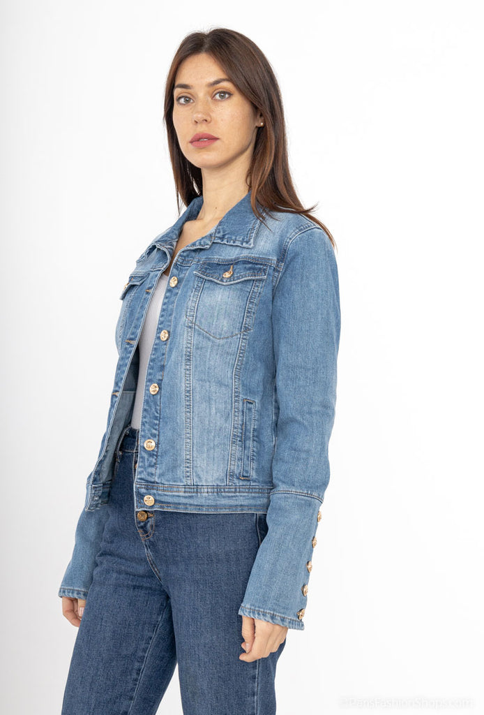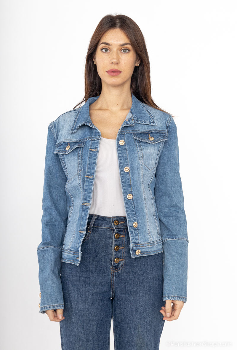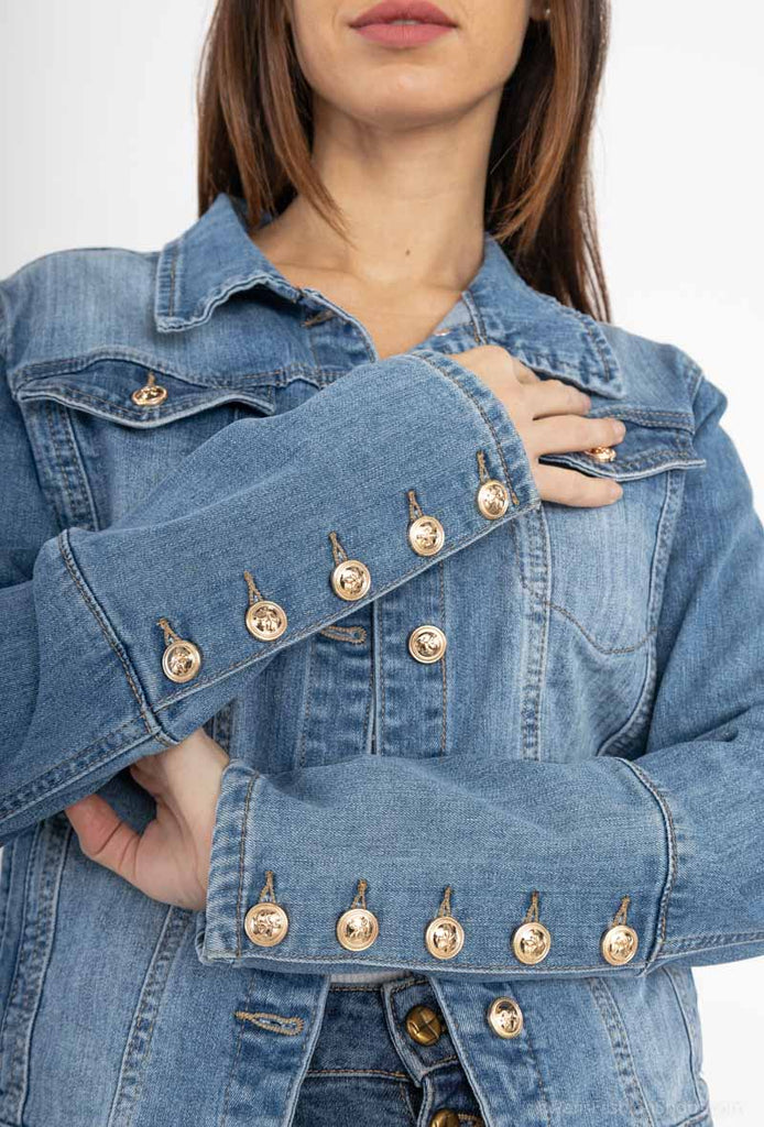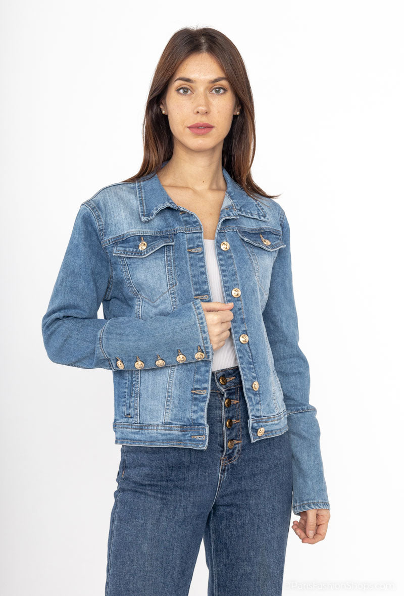 Mega cool denim jakke fra "Emsig Exclusive" med masser af stretch. Jakken har en hofte kort længde og fede chunky guldknapper.