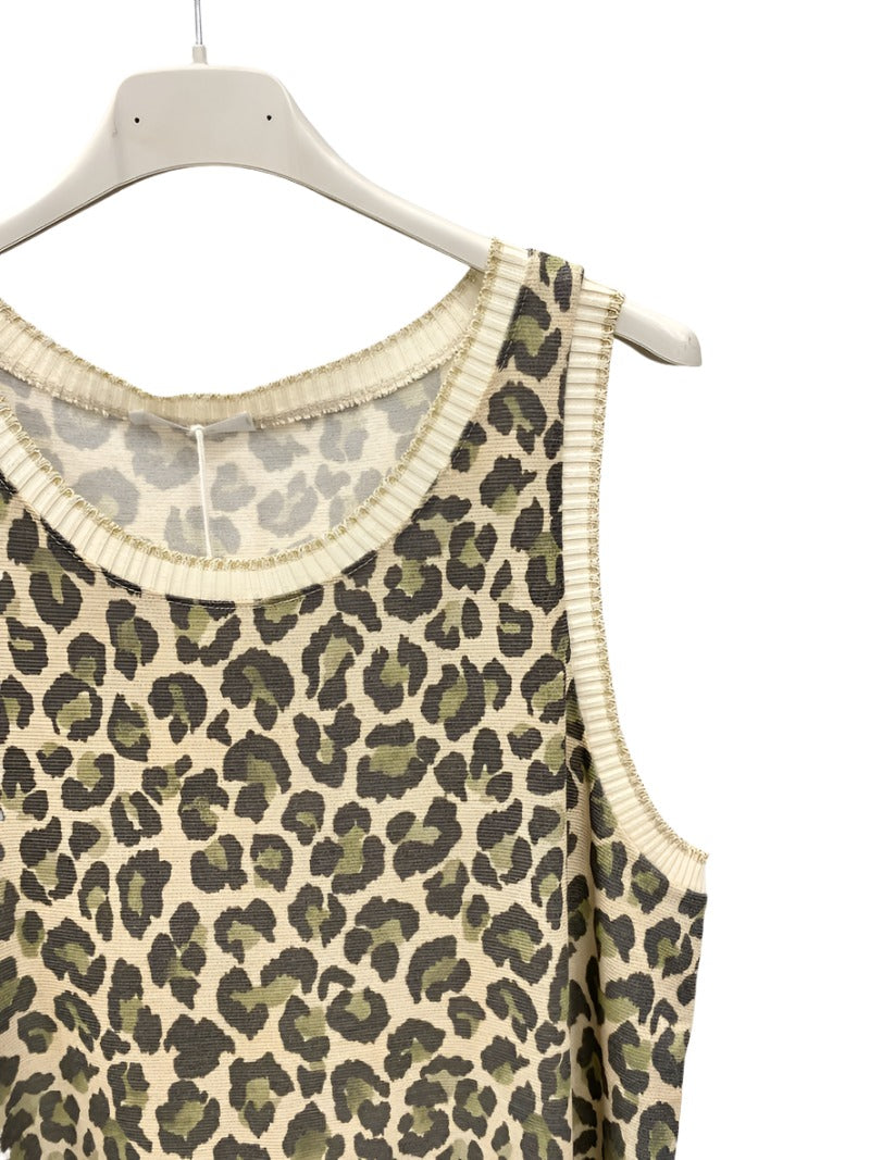 Skøn lang sommerkjole i leopard med lurex i guld. Kjolen er i en lækker viskosemix og har slids i siderne. Kjolen er med masser af stretch.
