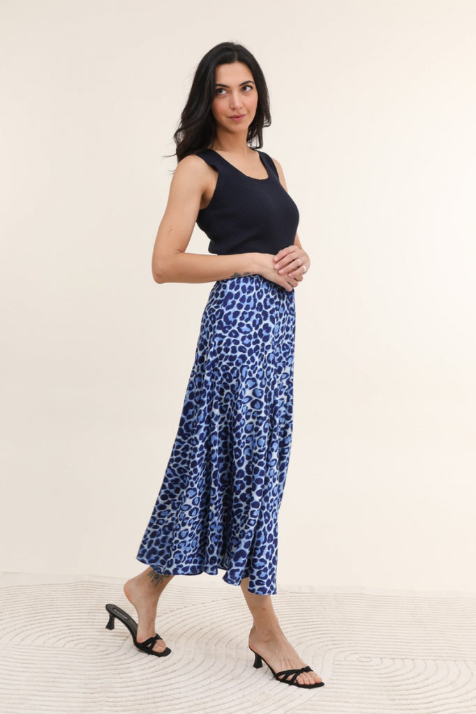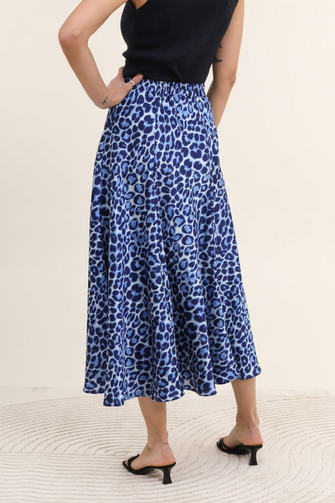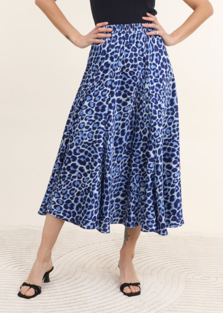 Skøn satin nederdel fra Emsig Exclusive i en tung metervare der falder smukt lang kroppen. Nederdelen har let A-facon og er i et smukt blå leopardprint.