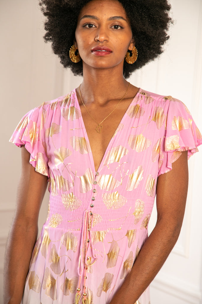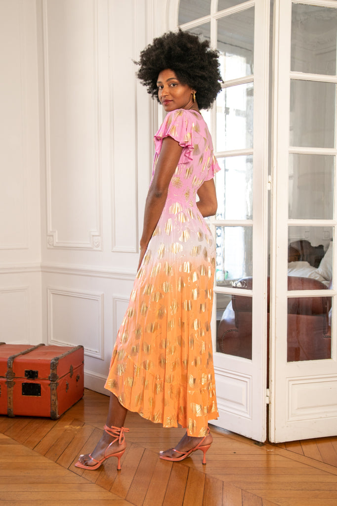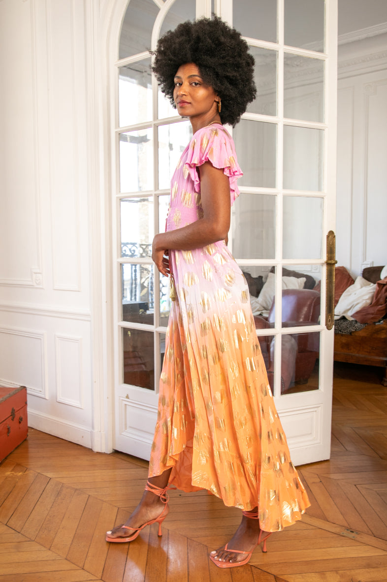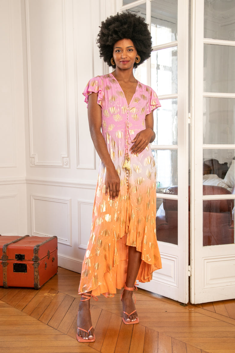 Smuk viskosekjole fra "Emsig Excluisve" i en flot farvekombination af lyserød og orange med guldblade. Kjolen har smock under barmen, der marker der, hvor vi er smallest og giver en smuk figur. Cille bruger L og Pernille S