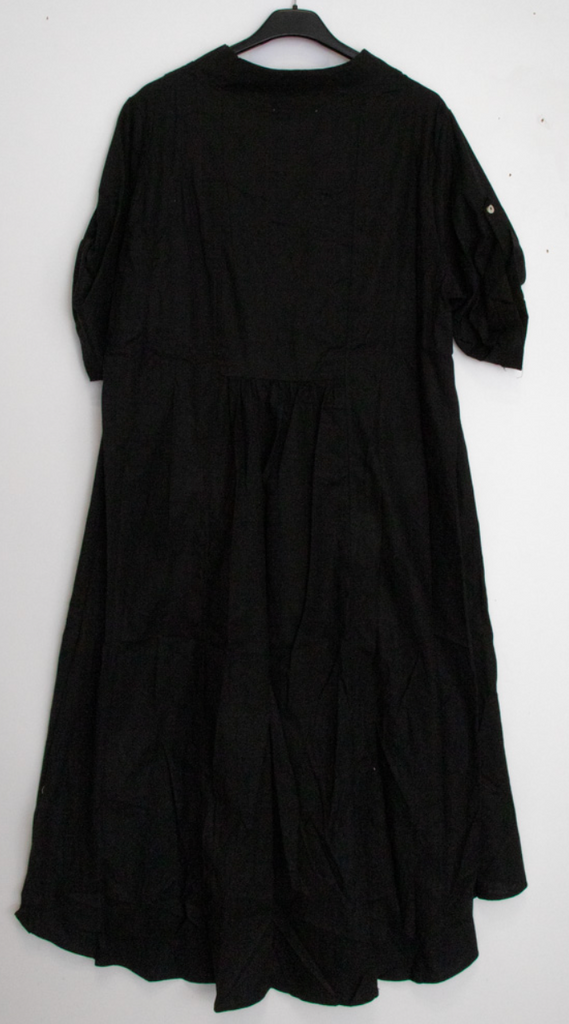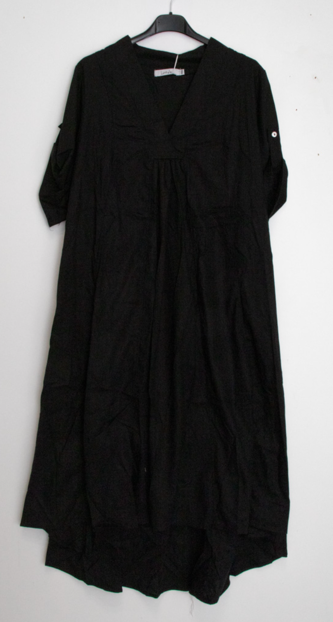 Sommerlig hørkjole i sort med v-hals og korte ærmer med opsmøg. Kjolen er længere bagtil og har flatterende snit.