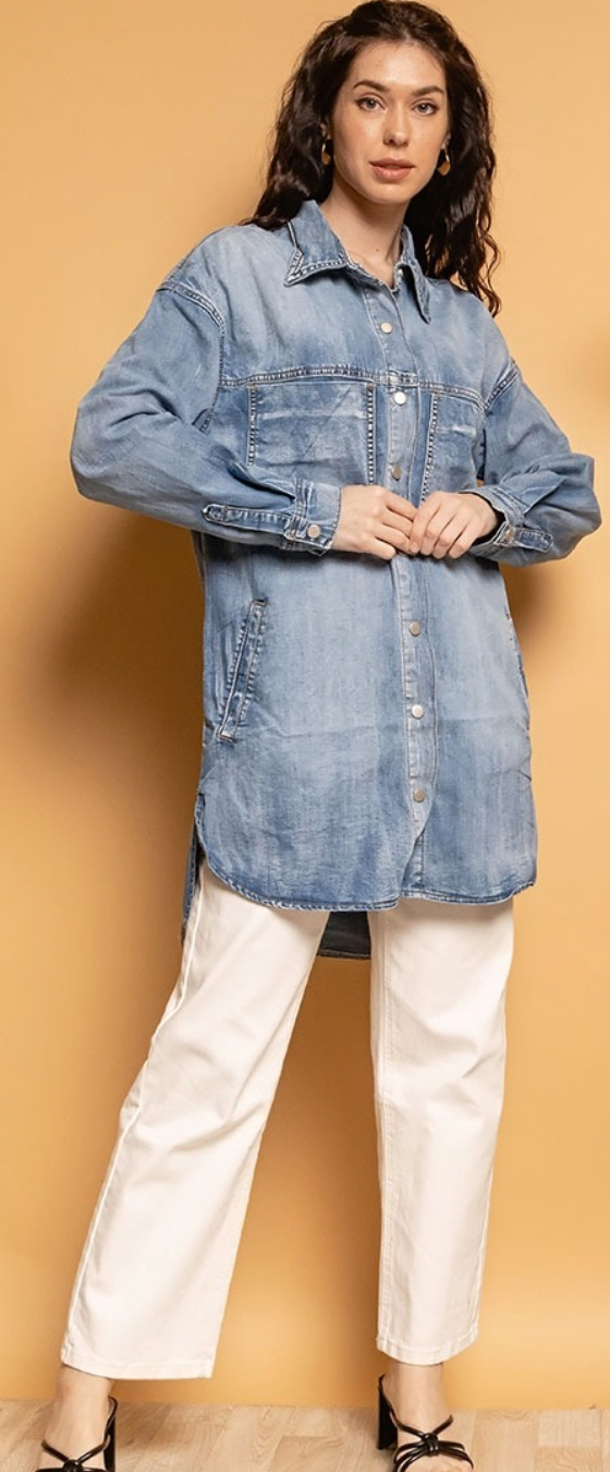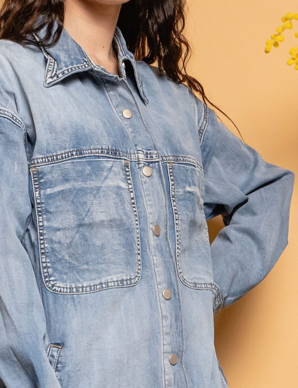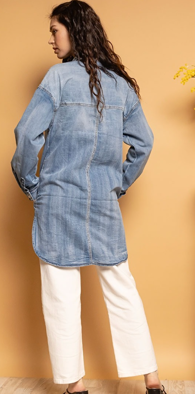 Mega cool denim jakke i en let kvalitet fra Emsig Exclusive. Jakken Har fede sliddetaljer i vasken og lukkes fortil med trykknapper. Jakken har bryst- og sidelommer og er længere bagtil.