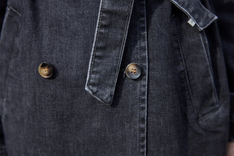Top fed trenchcoat i en rå "forvasket" sort fra Emsig Exclusive. Jakken har sidelommer, slids bagtil og et aftagelig bindebånd der marker taljen.