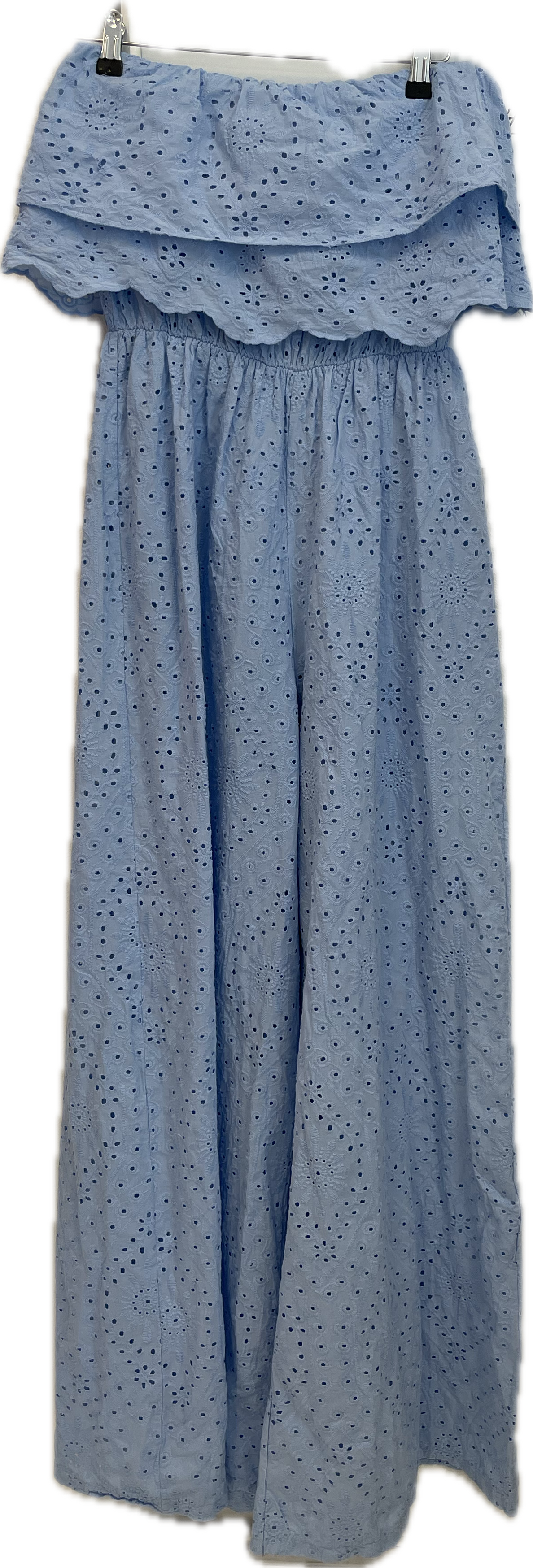 Fineste off-shoulder buksedragt i en smuk blå i broderianglaise.