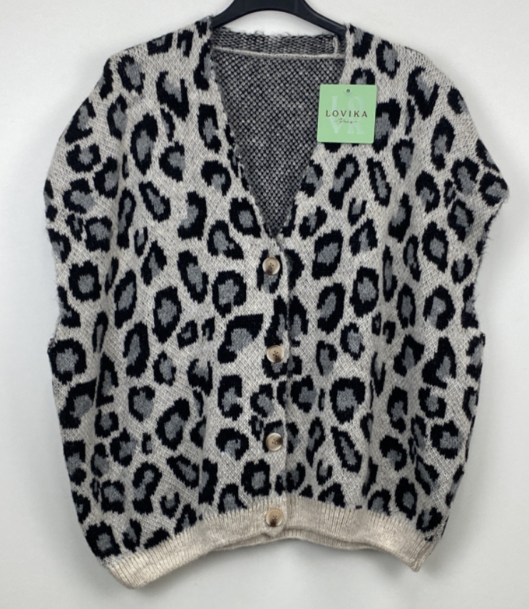 Skøn strikvest fra Emsig Exclusive i grå leoprint. Strikken har v-udskæring og lukkes fortil med knapper.