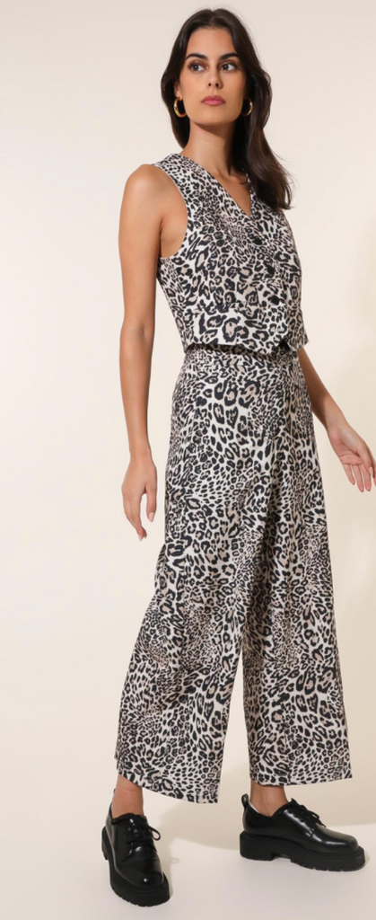 Skønne bukser i leoprint fra Emsig Exclusive, som passer perfekt sammen med Lulu vesten i samme print. Bukserne har vidde i benene og er korte i modellen.