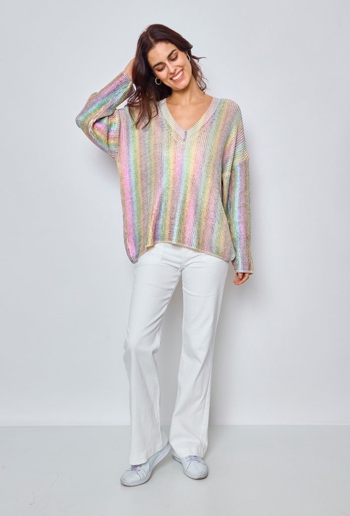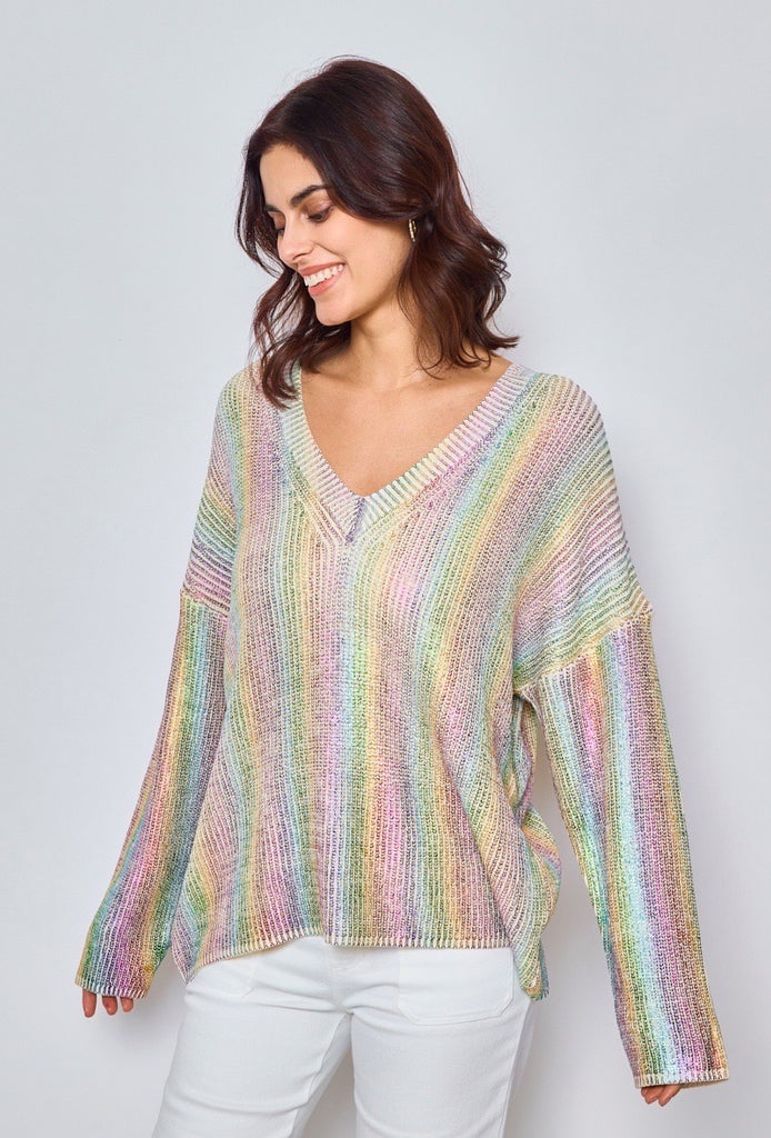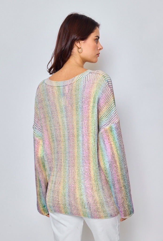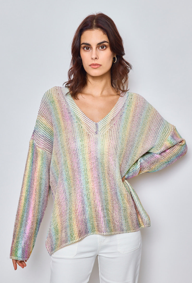 Fin strik spækket med detaljer. Strikken har en overflade med metallignende effekt i regnbuens farver. Strikken har v-hals og falder flot langs kroppen.