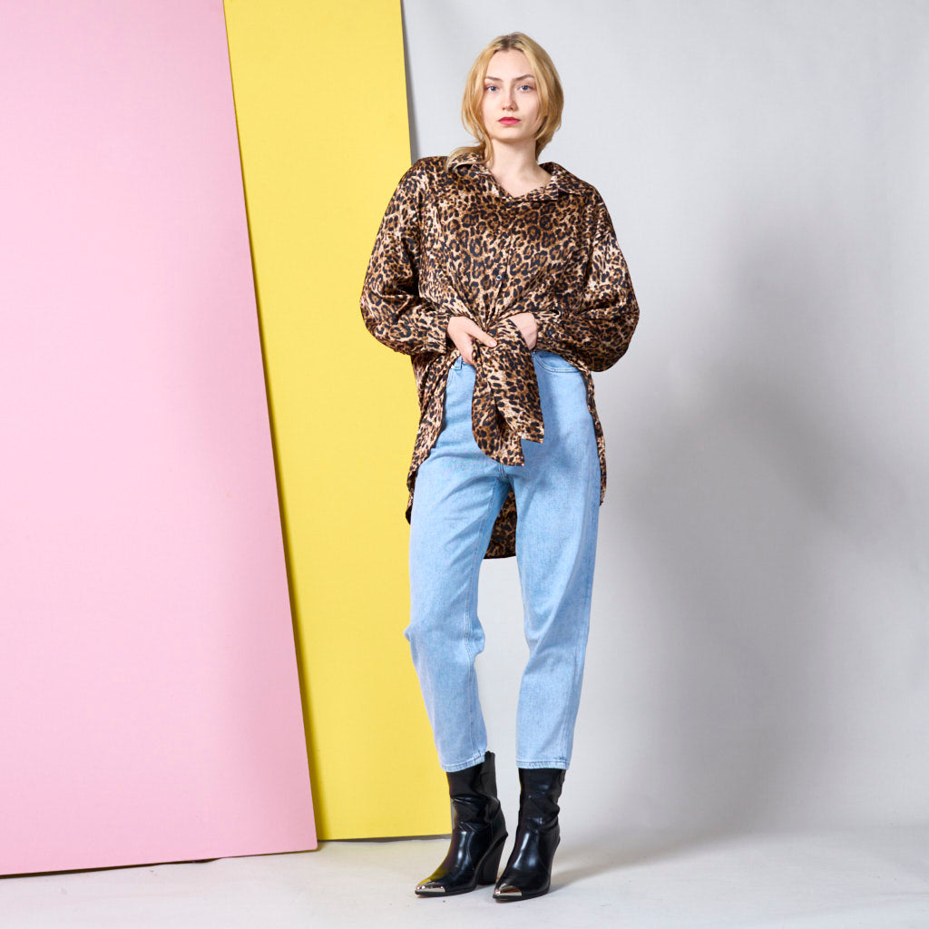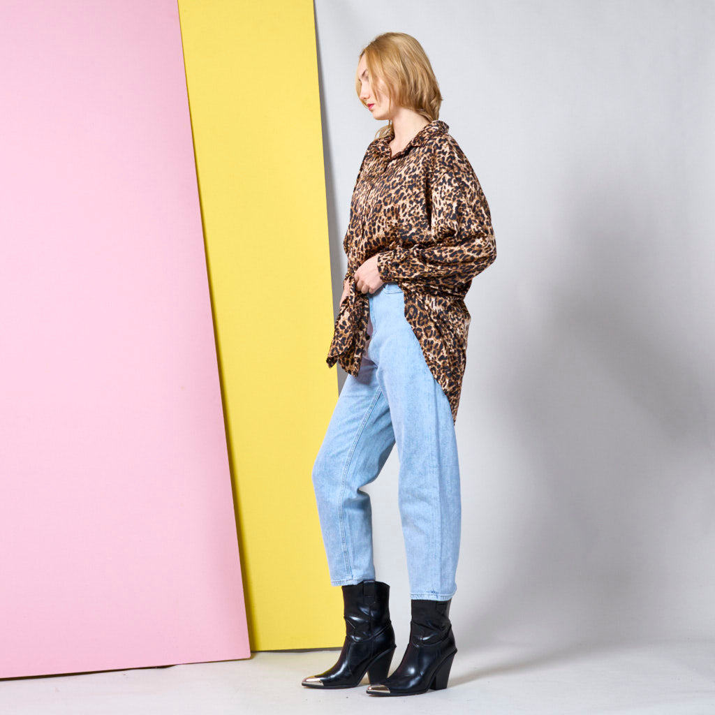 Cool oversize skjorte i et fedt leopardprint fra Emsig Exclusive. Skjorten er i en satinlignende kvalitet og er længere bagtil.