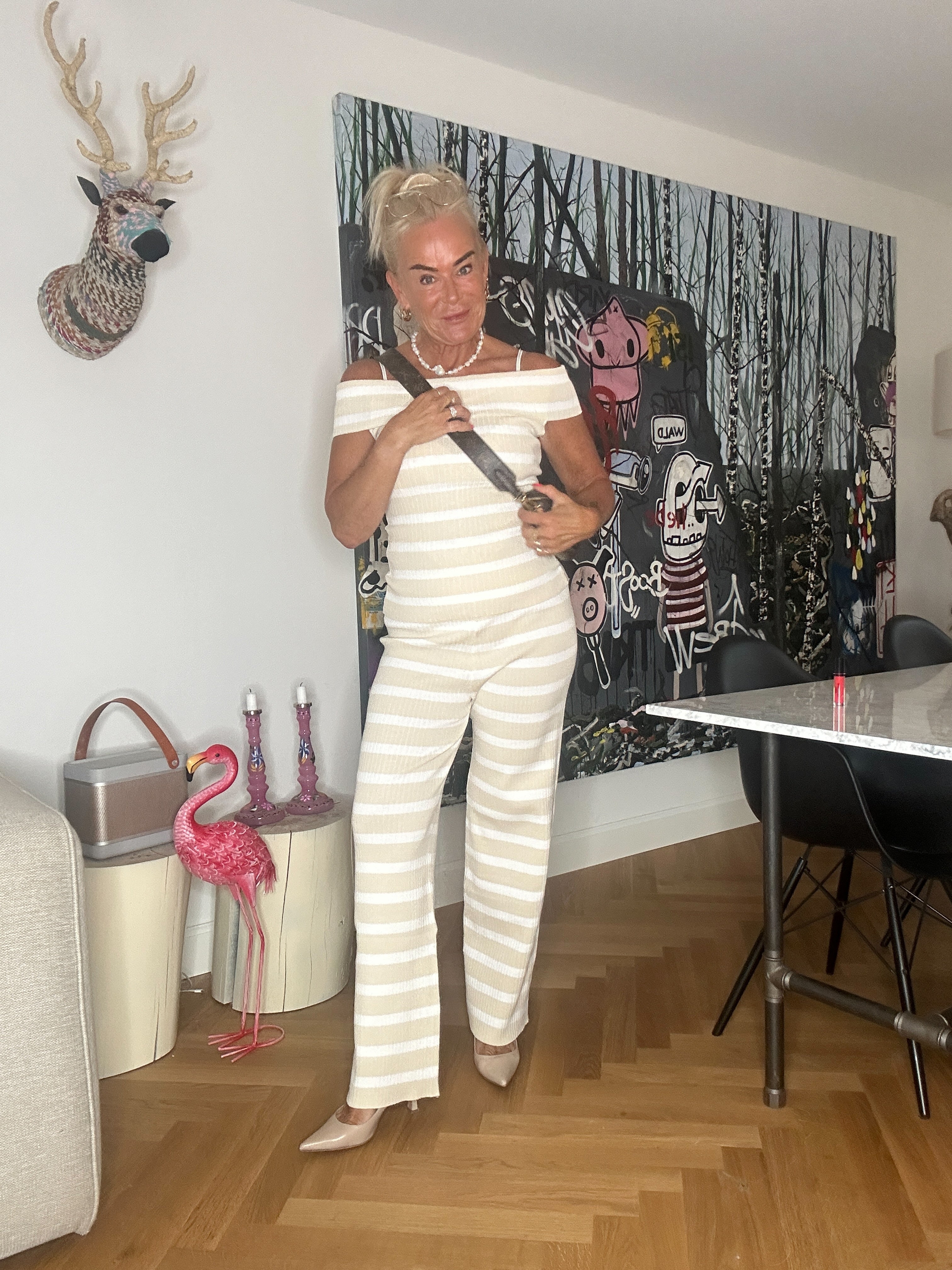 Skønneste sæt i strik. Bukserne er helt plain "pull on" model med bred, blød elastik i taljen og lige ben. Blusen er figursyet men ikke super stram, så der er plads til maven ;-) Blusen kan bruges off shoulder og almindeligt som top.