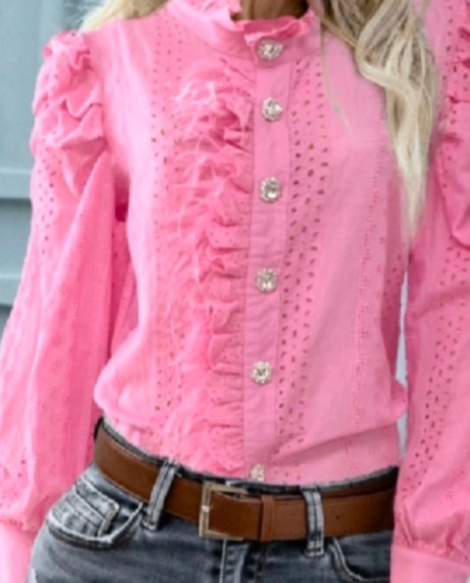 Detaljerig pink skjorte med flotte knapper og små fjer ved knappelukningen.