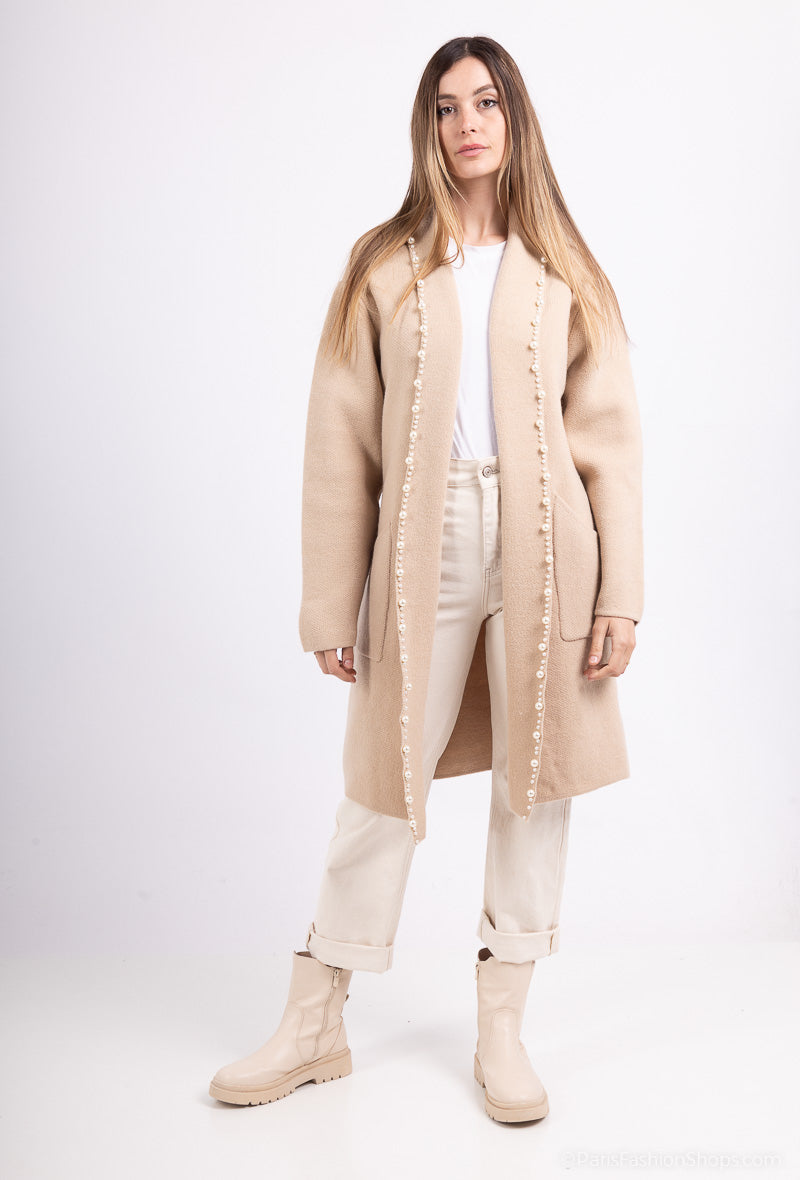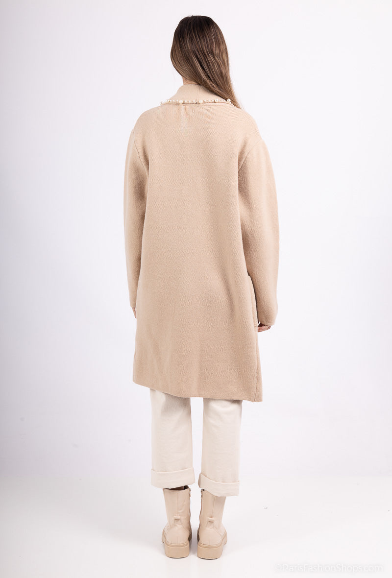 Cool lang cardigan fra Emsig Exclusive. Cardiganen er en åbenstående model og har finde detaljer med store og små perler.