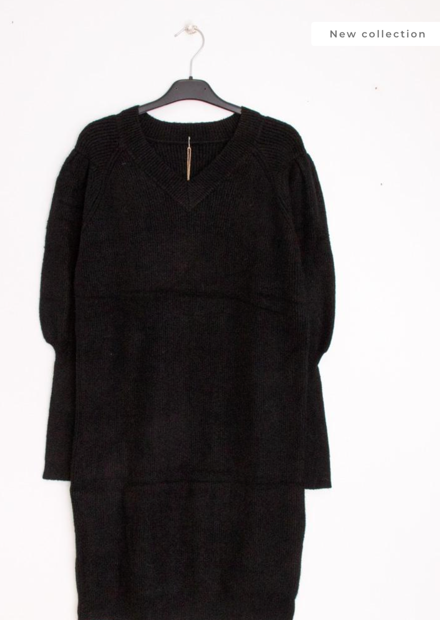 Super skøn strik kjole med cashmere. Kjolen har v-udskæring, ballonærmer afsluttet med lang manchet.