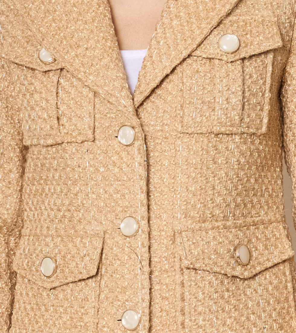 Smukkeste tweed jakke i beige. Jakken har de flotteste detaljer og flot og flatterende pasform.