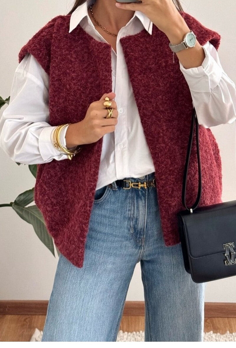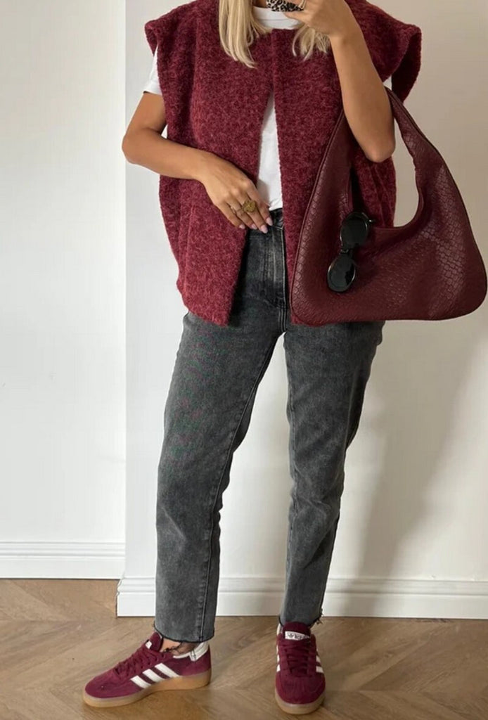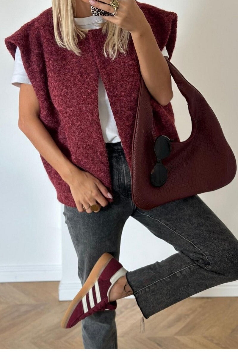 Skønneste vest fra Emsig Exclusive i en uld-lignende kvalitet. Vesten er åbensstående har lommer i siderne og kommer i sæsonens skønne bordo farve.