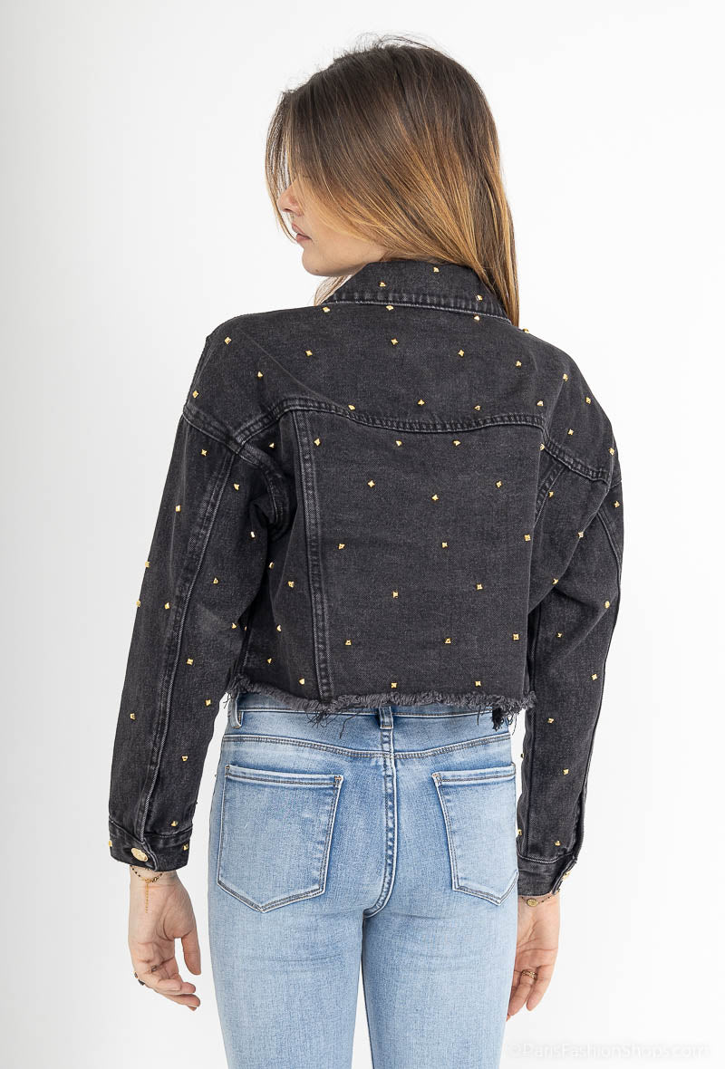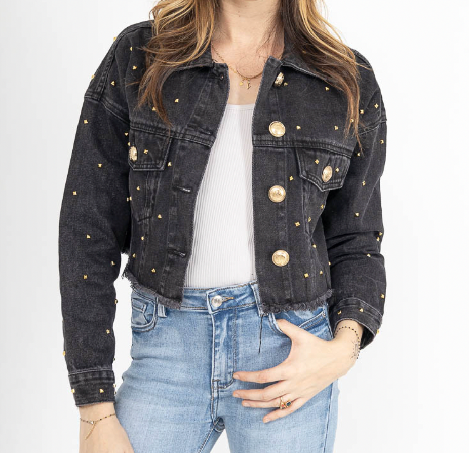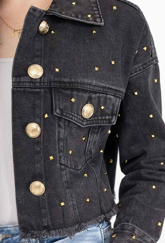 Den fedeste denimjakke er landet fra "Emsig Exclusive". Jakken er i en blød denimkvalitet , har chunky guldknapper og dekoreret med nitter. Modellen er kort og har rå kanter. Du kan roligt gå er nummer ned - den er rummelig