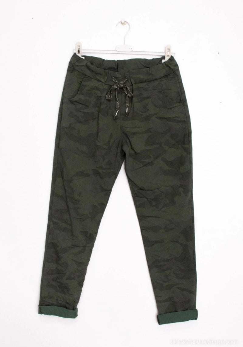 Den cool superstrecth buks fra Emsig Exclusive i en flot mørkegrøn camouflage. Pasformen er let baggy, ankel model og med blød elastik og snøre i taljen.