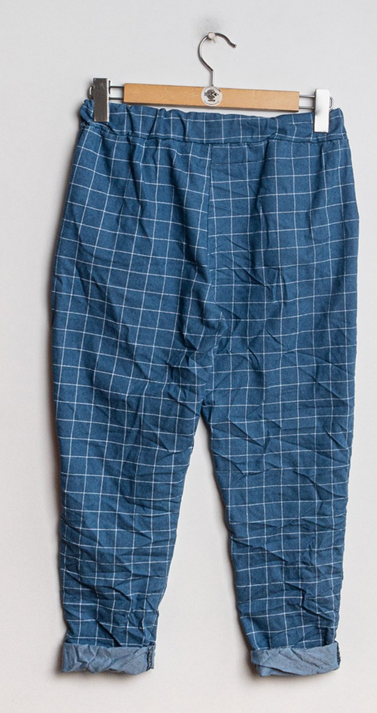 Den cool superstrecth buks fra Emsig Exclusive i en flot blå farve med hvide tern. Pasformen er let baggy, ankel model og med blød elastik og snøre i taljen.