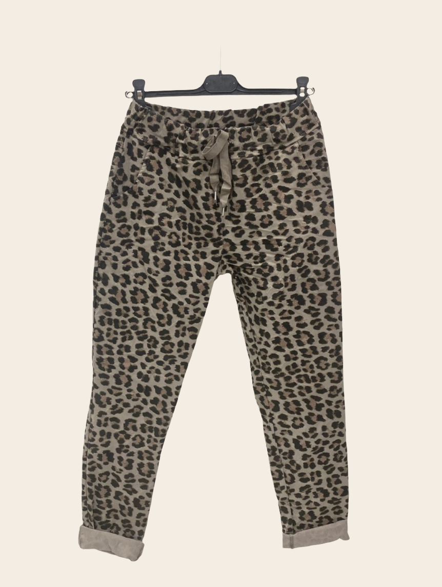 Den cool superstrecth buks fra Emsig Exclusive i en taupe leopard. Pasformen er let baggy, ankel model og med blød elastik og snøre i taljen. Den.ne model er en sommerudgave og kvaliteten er derfor tyndere