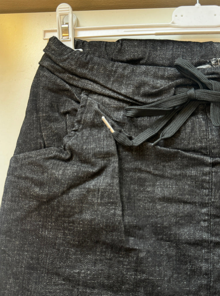 Lækker super stretch nederdel fra Emsig Exclusive i sort meleret print. Nederdelen har en blød elastik i taljen og snøre.