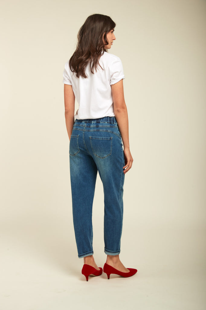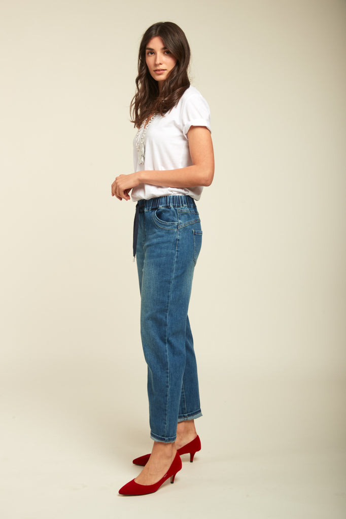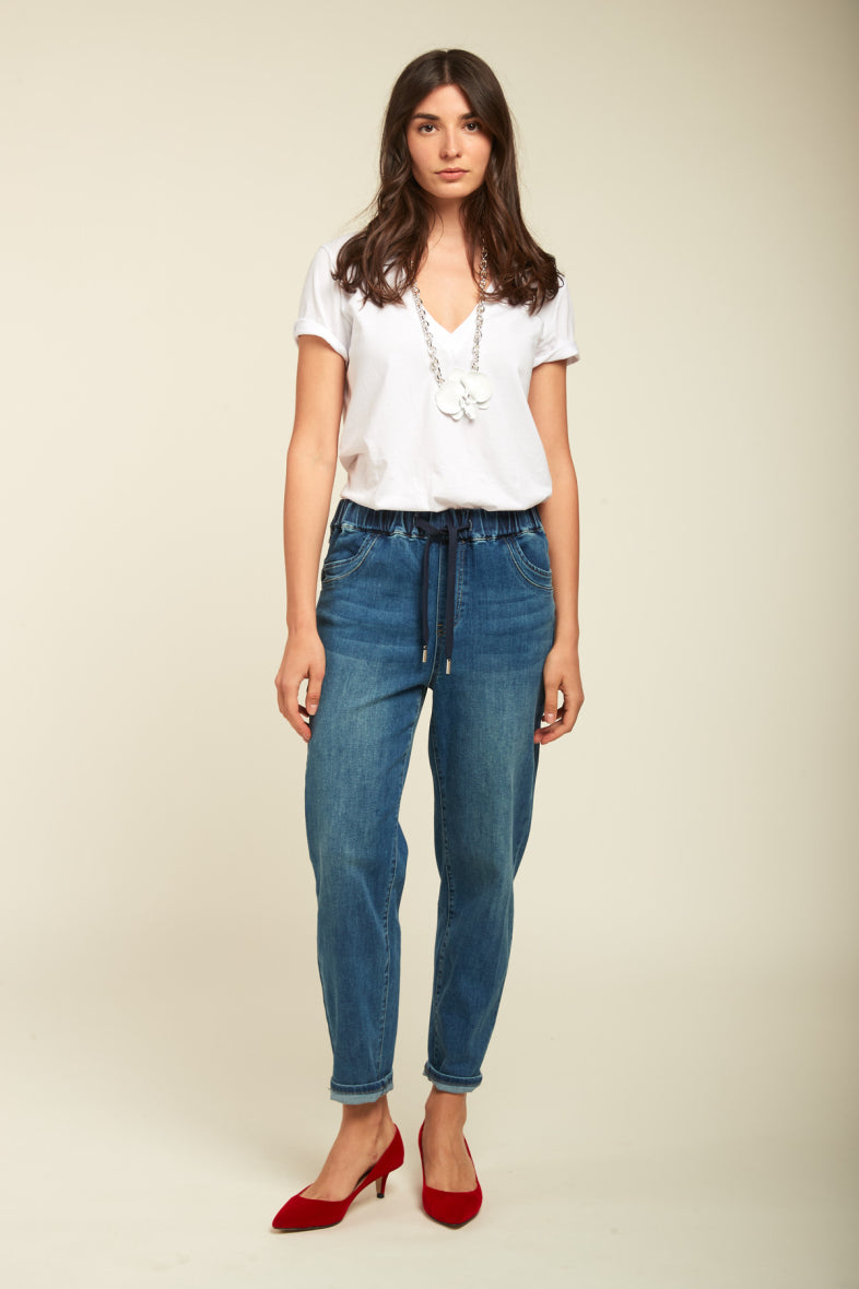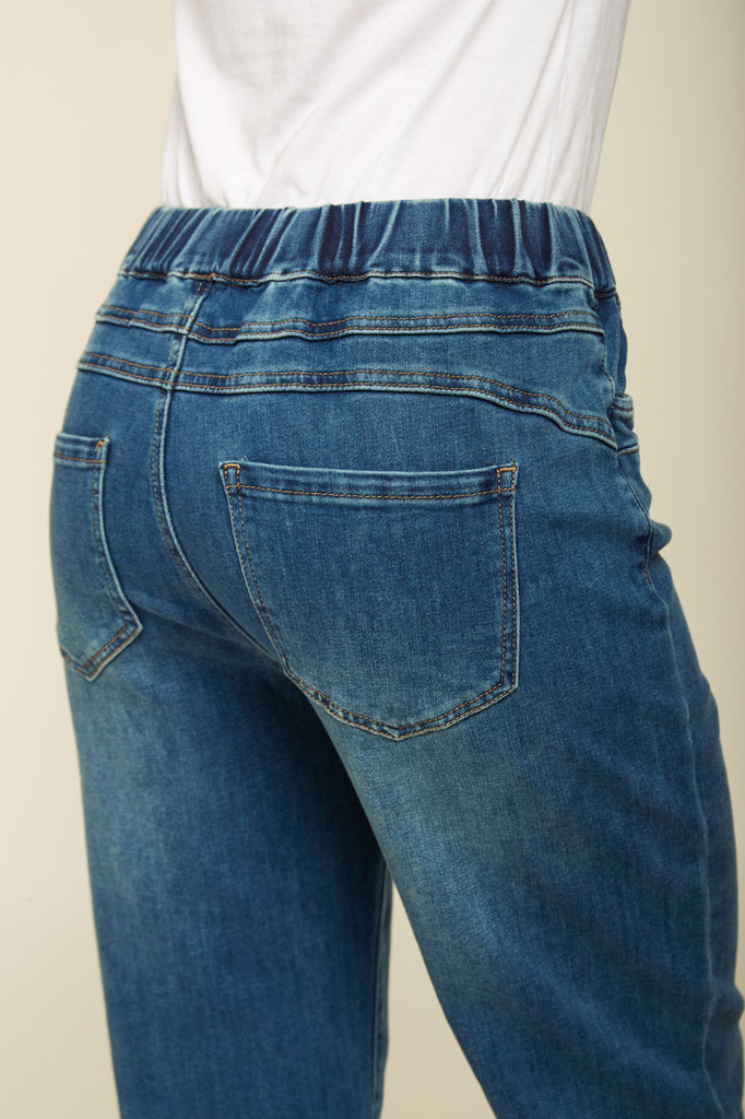 De blødeste baggy jeans fra Emsig Exclusive. Jeansene har et straight fit med elastik i taljen og snøre. Med skrålommer, baglommer og masser af stretch!